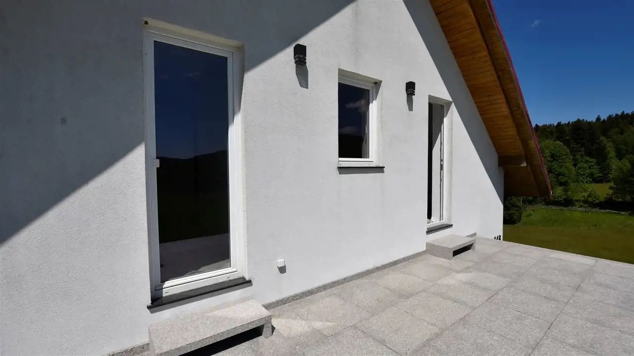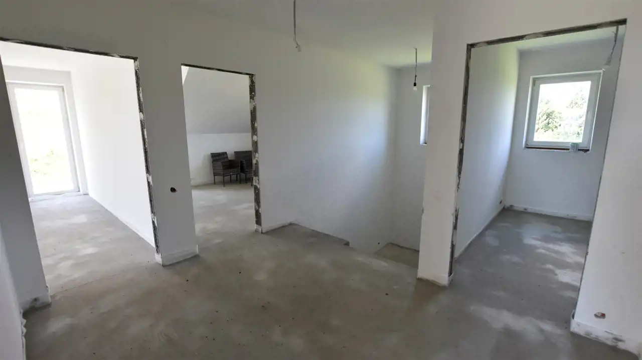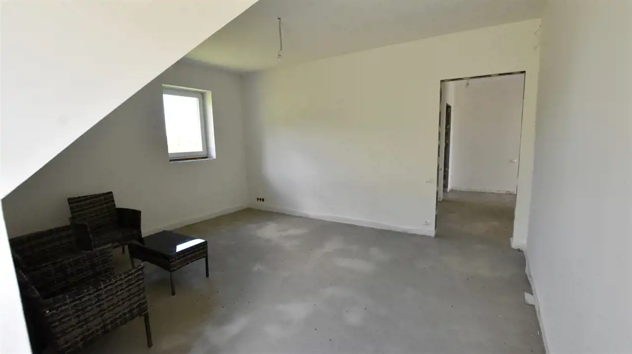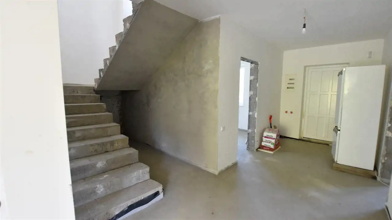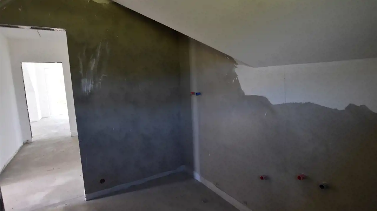 Budynek wybudowany z pustaka, ocieplony styropianem, pokrycie dachowe blacho dachówka wraz z podbitką dachową, okna plastikowe w kolorze białym. Wykonano parapety zewnętrzne. Wewnątrz wykonana została elektryka, sieć wodno-kanalizacyjna, tynki. Budynek posiada wykonane odwodnienie. Balkony na poddaszu wykończone zostały gresem, wokół budynku wykonana została kostka wraz z podjazdem do garażu. Na schodach wyprowadzone jest podświetlenie oraz zamontowane zostało okno, które dodatkowo doświetla wnętrze. Do wykonania jest ogrzewanie, które dopasować można do własnych potrzeb.