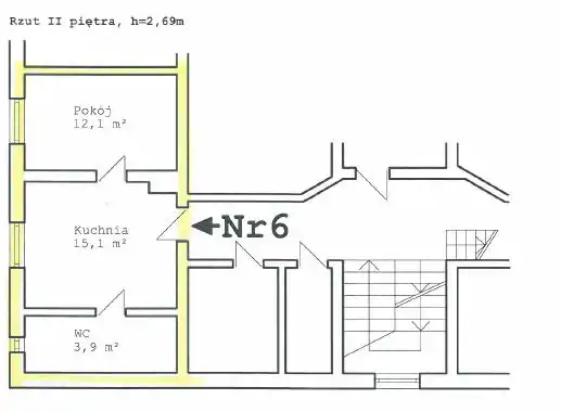 Lokal mieszkalny nr 6 o powierzchni użytkowej 31,10 m² zlokalizowany jest na poddaszu (II piętro) budynku, składa się z: pokoju, kuchni, WC. Do mieszkania przynależy piwnica o powierzchni użytkowej 4,20 m2.