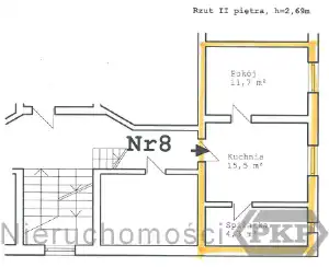 Lokal mieszkalny nr 8 o powierzchni użytkowej 31,50 m² położony na II piętrze budynku, składa się z: pokoju, kuchni, spiżarki wraz z pomieszczeniami przynależnymi WC w budynku toalet i komórką w budynku gospodarczym nr 1 o łącznej powierzchni użytkowej 11,50 m2.
