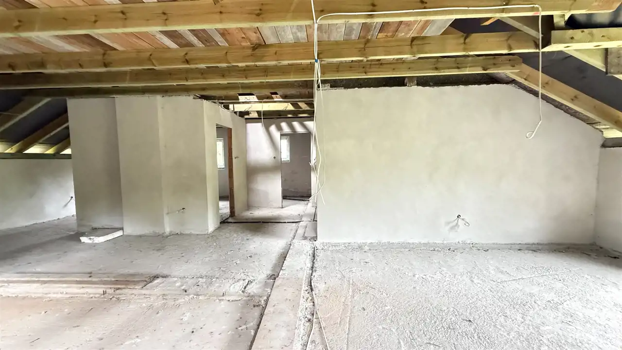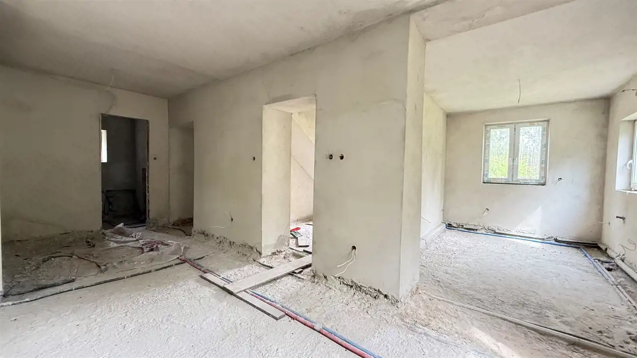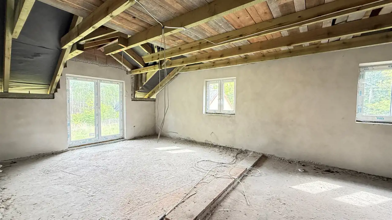 Dom posiada nowe instalacje oraz okna PCV. Dach pokryty jest blachą, a budynek został wybudowany w 2020 roku. Woda pochodzi ze studni, a prąd jest już doprowadzony do nieruchomości. Budynek jest jeszcze w fazie wykończenia, nieocieplony i nieotynkowany, jednak jego potencjał jest ogromny – istnieje możliwość dostosowania wnętrza do własnych potrzeb.