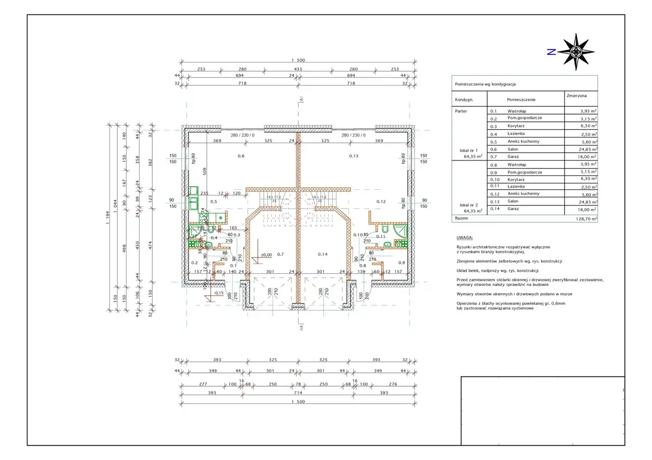- parter: salon (24,85m 2 ), aneks kuchenny (5,60m 2 ), wiatrołap (3,95m 2 ), łazienka (2,50 m 2 ), pom. gospodarcze (3,15m 2 ), korytarz (6,30m 2 ), garaż (18 m 2 ).