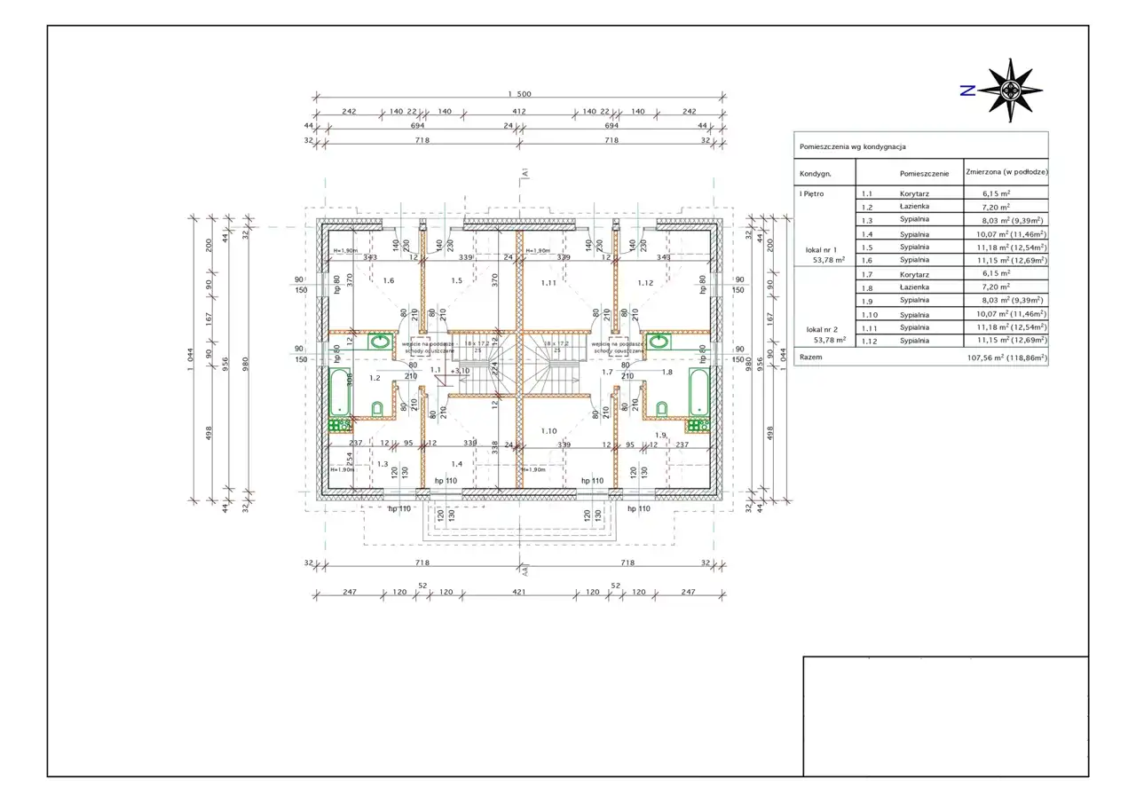 - piętro (mierzone po podłodze) : sypialnia (12,69 m 2 ), sypialnia (12,54 m 2 ), sypialnia (11,46 m 2 ), sypialnia (11,86 m 2 ), łazienka (7,2m 2 ), korytarz (6,15m 2 ).