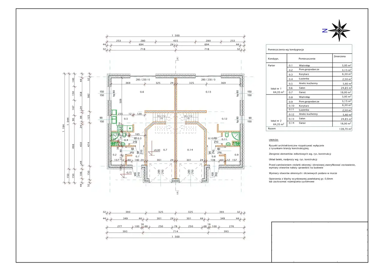 - parter: salon (24,85m2), aneks kuchenny (5,60m2), wiatrołap (3,95m2), łazienka (2,50 m2), pom. gospodarcze (3,15m2), korytarz (6,30m2), garaż (18 m2).