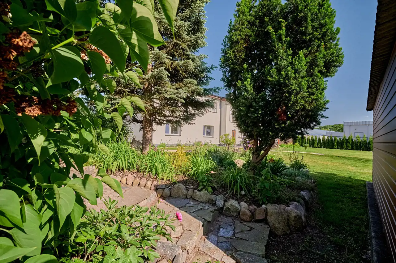 - Pięknie zagospodarowana działka: dojrzałe nasadzenia drzew i krzewów, żywopłoty z tui, orzech dający coroczne plony
