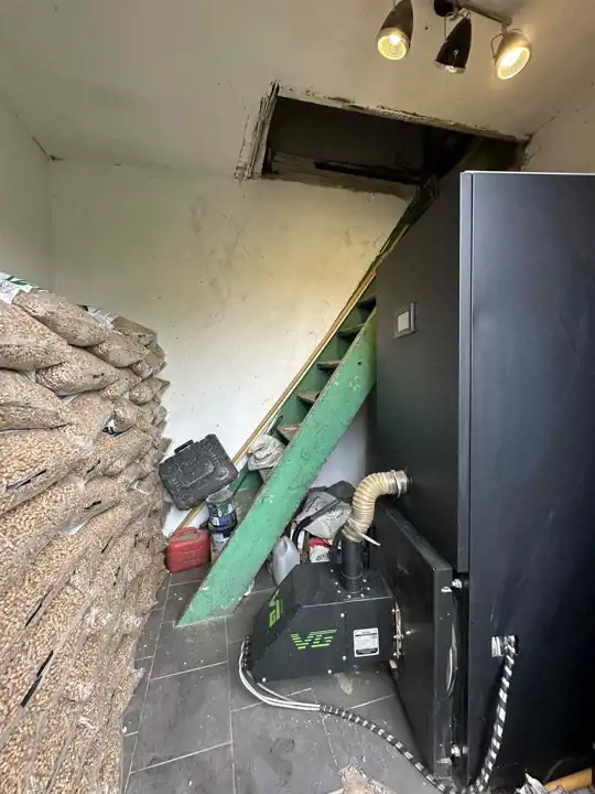 Ogrzewanie zapewnia nowoczesny, dwuletni piec Kostrzewa na pellet z zasobnikiem o pojemności 110 litrów, co gwarantuje ekonomiczne i ekologiczne użytkowanie.