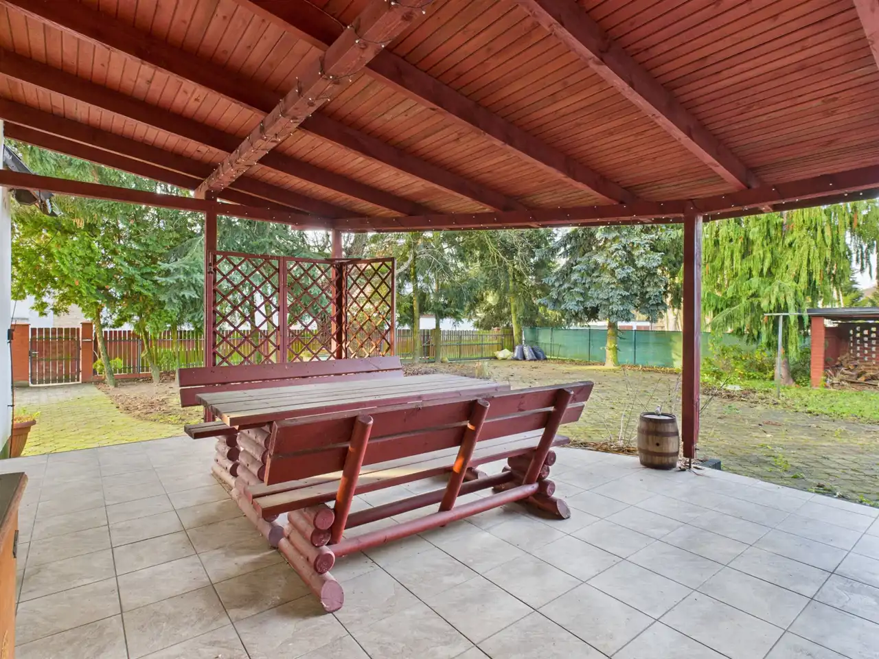 Całość ogrodzona. Na posesji duże drzewa.