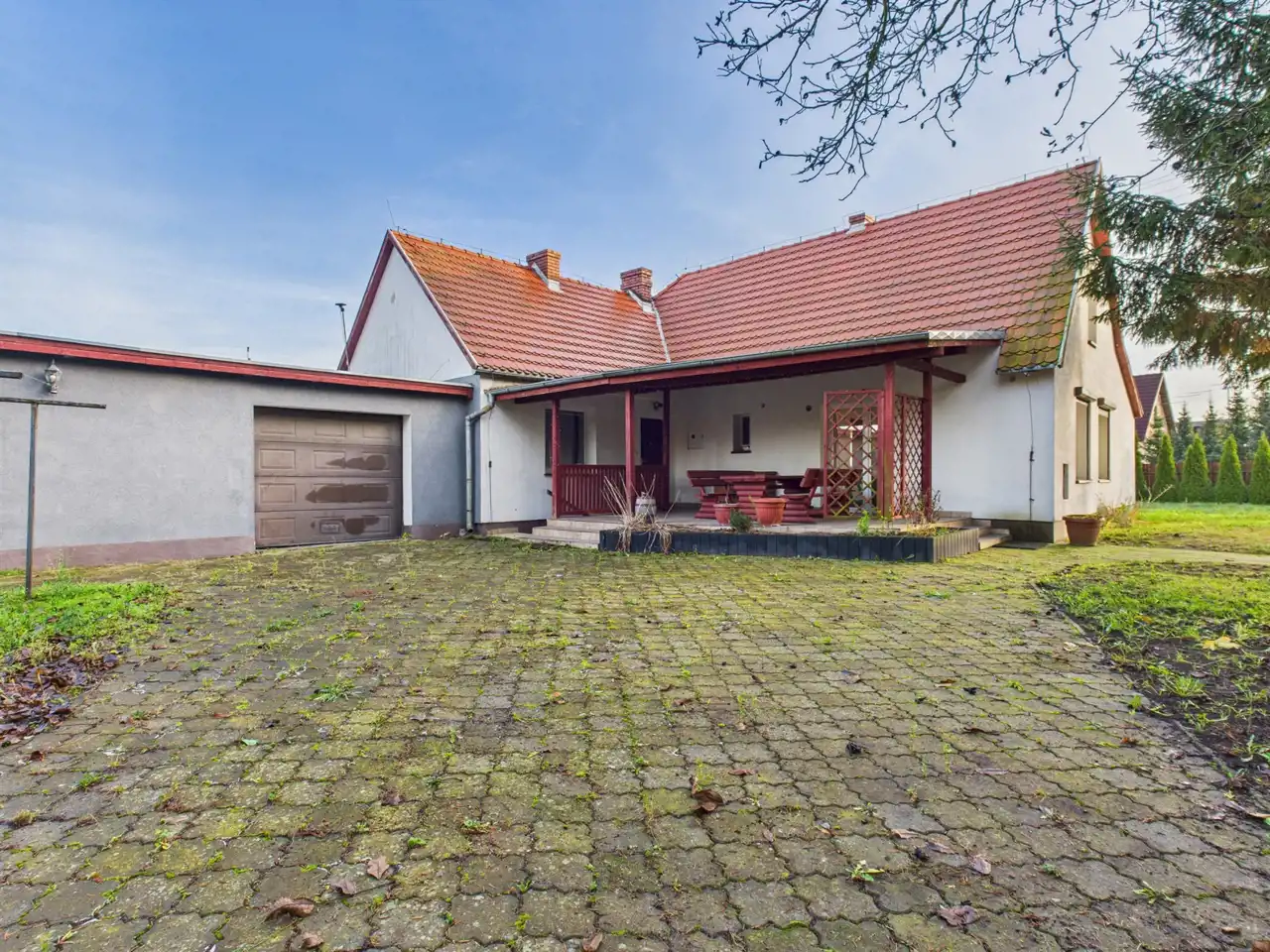 Dom jednorodzinny parterowy z poddaszem nieużytkowym i osobnym murowanym garażem.