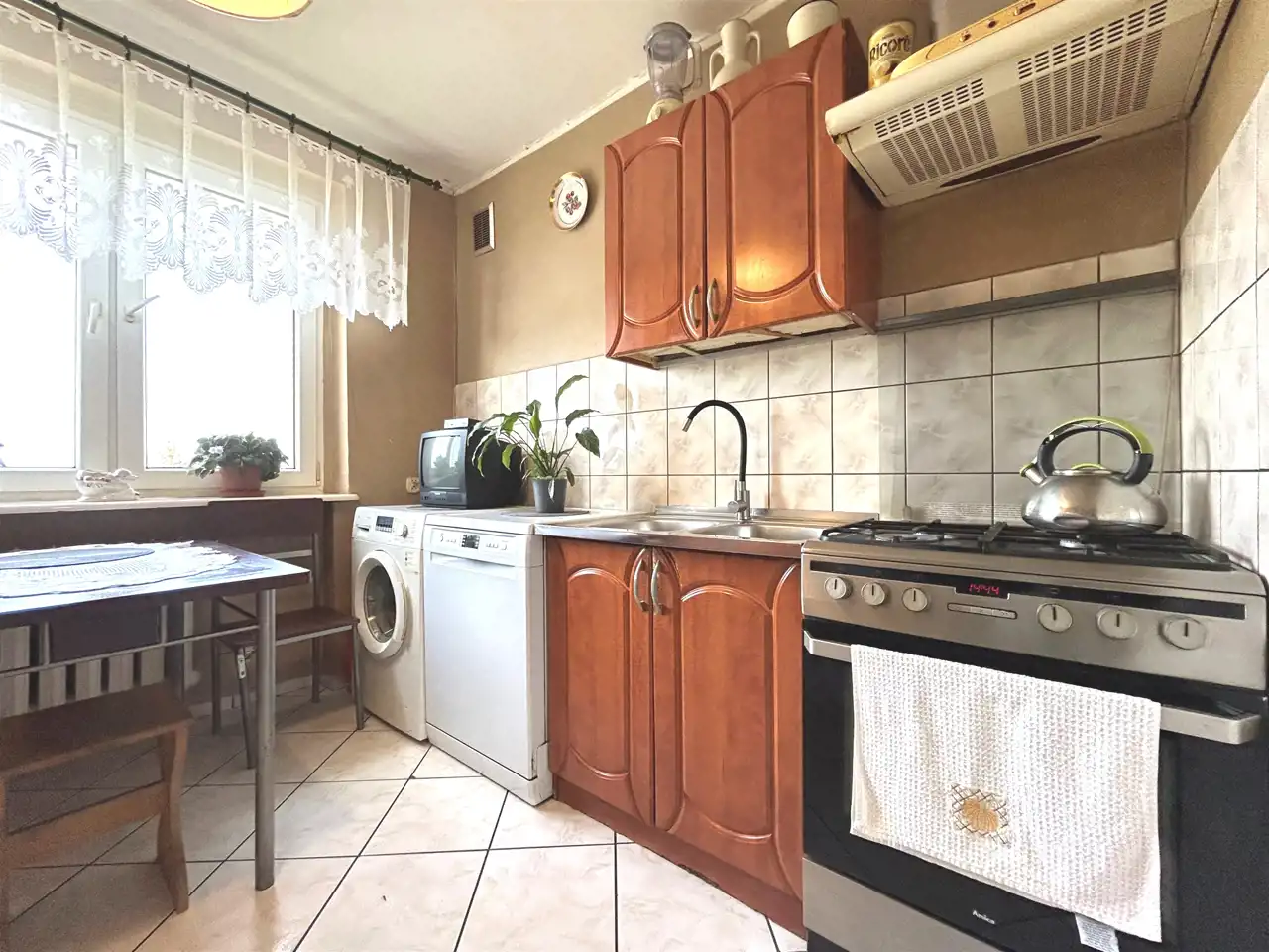 - Media Ogrzewanie: C.O. miejskie; Woda: tak-podgrzewacz elektryczny; Gaz: własna butla