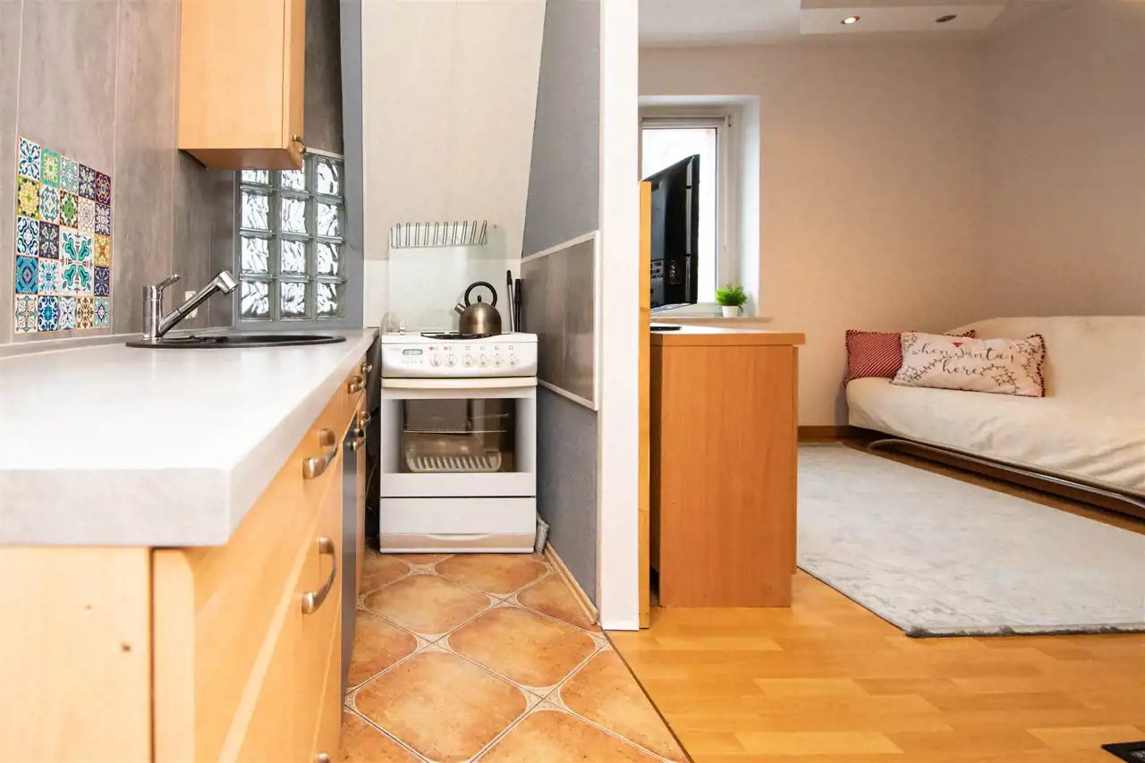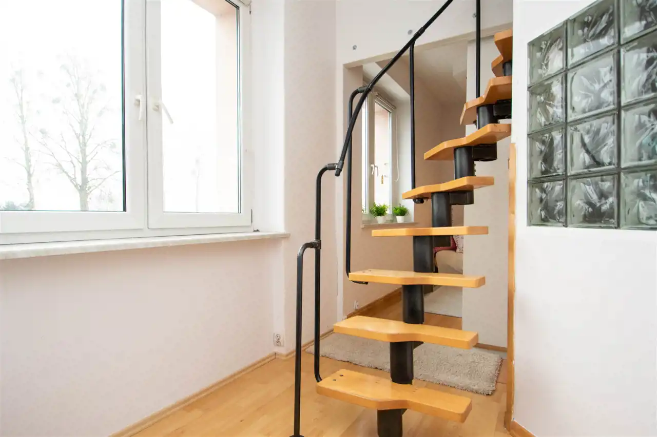 Mieszkanie składa się z przestronnego salonu stanowiącego strefę dzienną i jadalnianą, otwartego na kuchnię, łazienki i korytarza. Salon oddzielony od strefy sypialnej przesuwnymi, nowoczesnymi drzwiami. Na górze dwa niezależne pokoje oraz dwie garderoby.