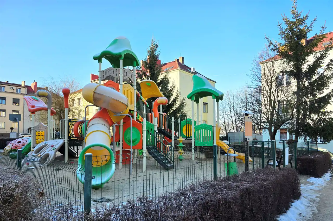 Przestronna kuchnia i duża sypialnia mają okna wychodzące na południe z widokiem na plac zabaw.