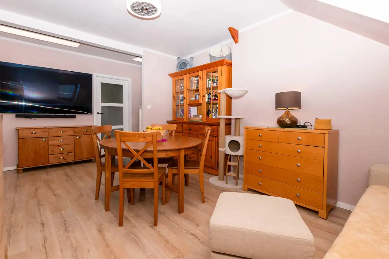- przestronny salon z aneksem kuchennym, który jest oddzielony wyspą kuchenną z sześcioma szufladami. Kuchnia posiada meble w zabudowie oraz niezbędny sprzęt AGD (płyta indukcyjna Samsung, pochłaniacz MPM, piekarnik dual cook Samsung, mikrofalówka Samsung, lodówka Heier, zmywarka 45 cm Hotpoint Ariston),
