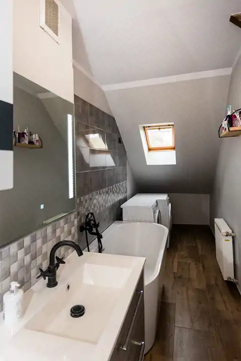 - łazienka z WC wyposażona w wannę, umywalkę, szafkę pod umywalką, podświetlane lustro, WC.