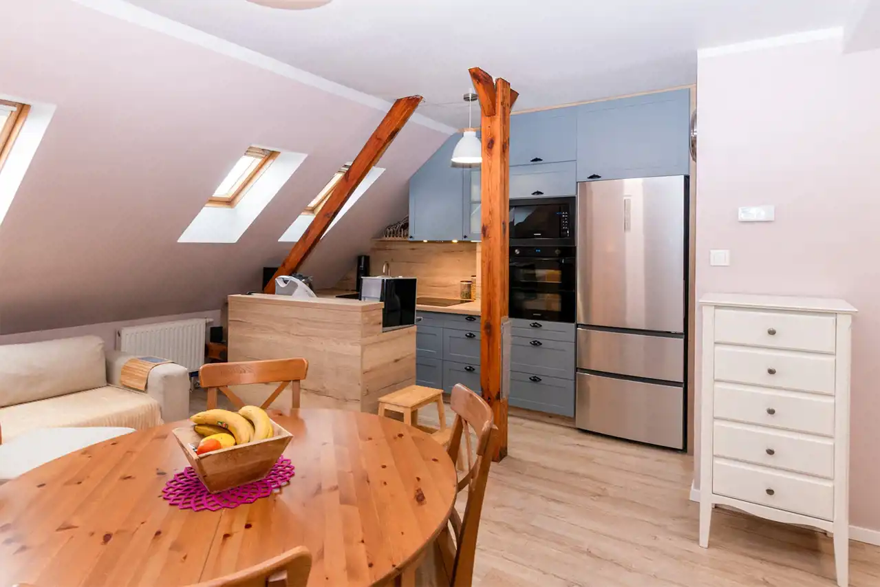 Mieszkanie zostało zaprojektowane z myślą o wygodzie codziennego życia. Ma bardzo przestronny układ, jest doskonale doświetlone przez okna połaciowe wyposażone w rolety wewnętrzne.