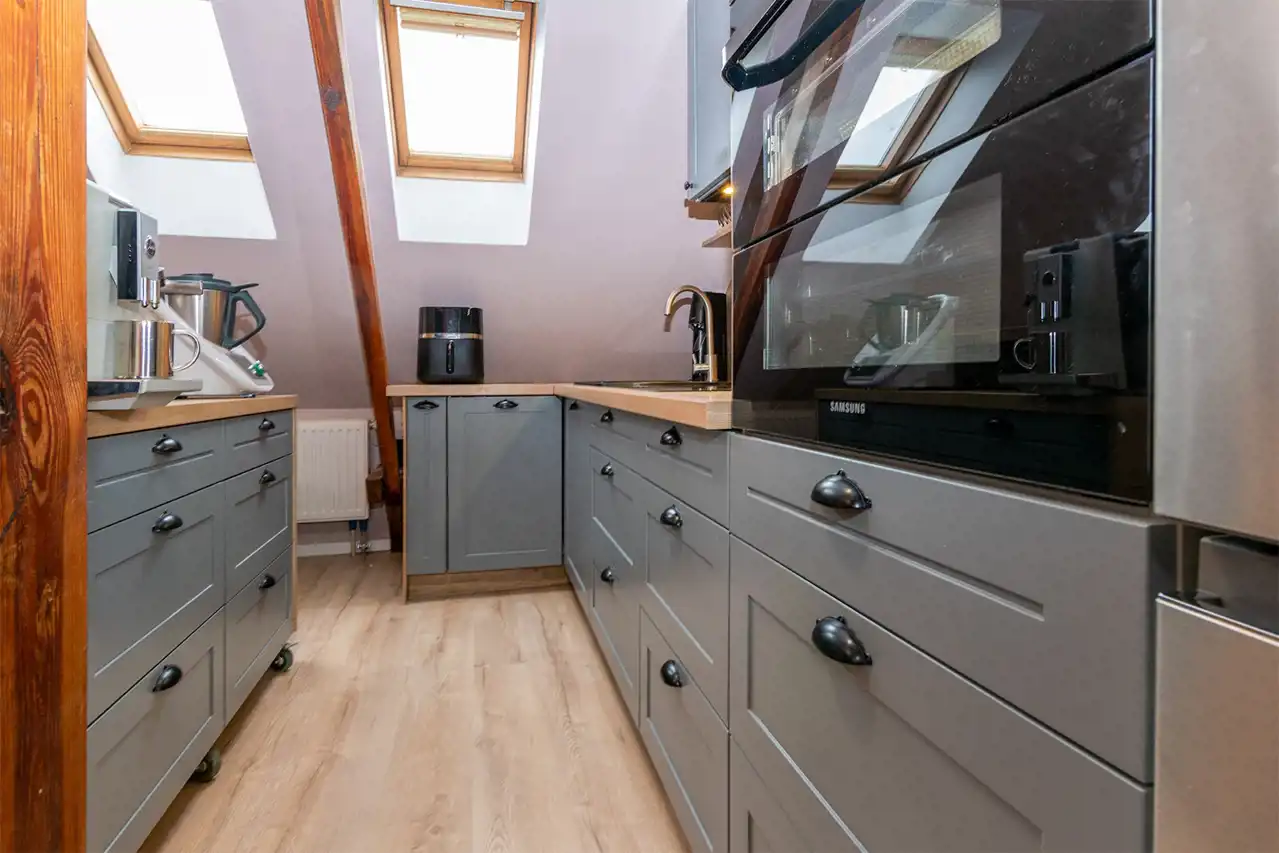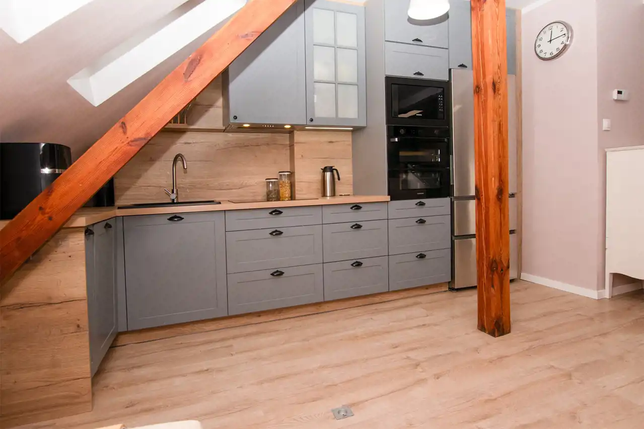 - przestronny salon z aneksem kuchennym, który jest oddzielony wyspą kuchenną z sześcioma szufladami. Kuchnia posiada meble w zabudowie oraz niezbędny sprzęt AGD (płyta indukcyjna Samsung, pochłaniacz MPM, piekarnik dual cook Samsung, mikrofalówka Samsung, lodówka Heier, zmywarka 45 cm Hotpoint Ariston),