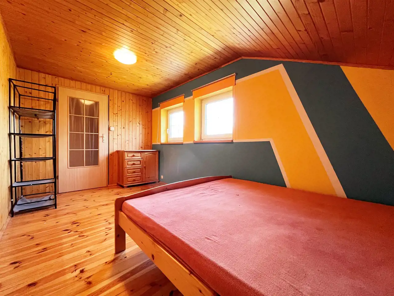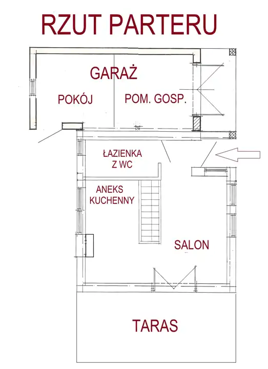 - garaż (pow. ok. 20 m2) obecnie podzielony lekką ścianką na 2 pomieszczenia: pokój ok. 10 m2 z zewnętrznym wejściem oraz pomieszczenie gospodarcze o pow. ok. 10 m2;