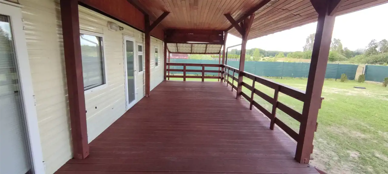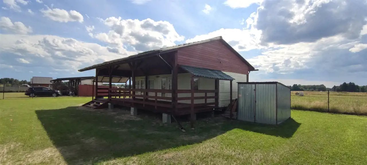 Na działce znajduje się domek typu mobilnego o powierzchni około 35 m², który został zabudowany przestronnym tarasem (ok. 35 m²). Taras stanowi integralną część konstrukcji, zapewniając dodatkową osłoniętą przestrzeń użytkową. Działka i zabudowania są gotowe do użytku od razu po zakupie.