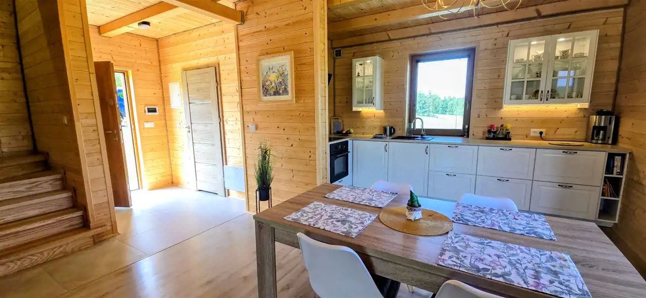 otwarta kuchnia z jadalnią – w pełni wyposażona, z oknem wychodzącym na ogród