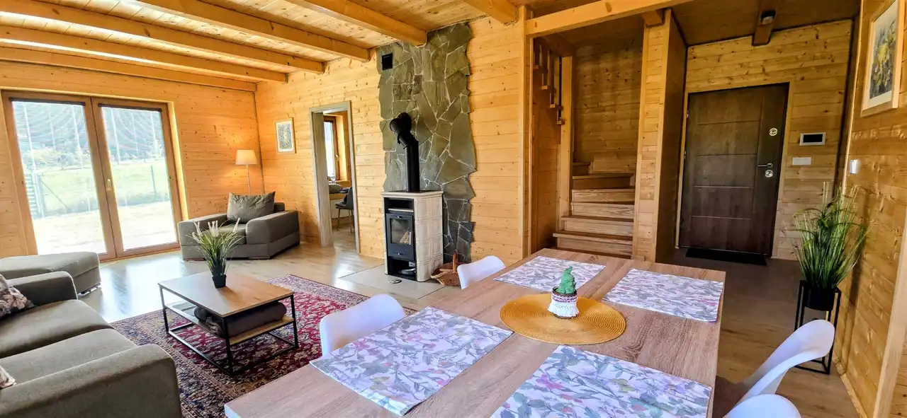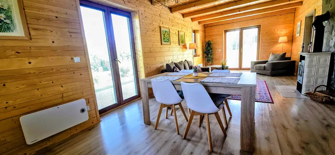 Budynek całoroczny, niepodpiwniczony o powierzchni 100 m2 , wybudowany w 2022 roku z drewna- system szkieletowy, ocieplony wełną mineralną o grubości 25 cm, dach pokryty blachodachówką, okna pakiet trzyszybowy kolor brązowy. Budynek w doskonałym stanie technicznym, w pełni umeblowany i wyposażony – gotowy do zamieszkania bez dodatkowych nakładów finansowych.