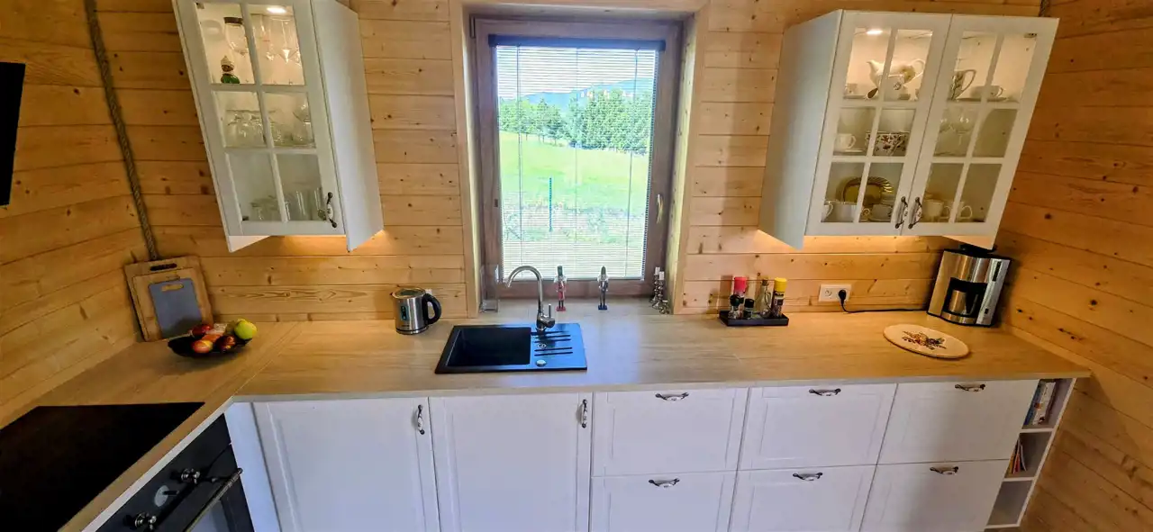 otwarta kuchnia z jadalnią – w pełni wyposażona, z oknem wychodzącym na ogród