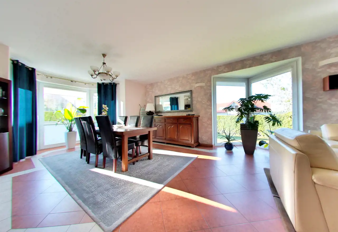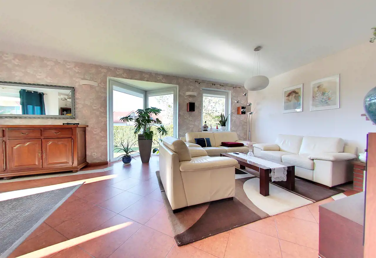 Na parterze znajduje się reprezentacyjna strefa dzienna – przestronny salon z jadalnią i kominkiem (ok. 38 m²), tworzący serce domu, w którym z łatwością można zorganizować spotkania w gronie rodziny i przyjaciół. Z salonu bezpośrednie wyjście prowadzi do ogrodu – miejsca idealnego na poranną kawę lub letnie kolacje na świeżym powietrzu.