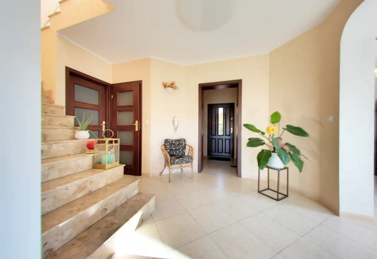 Na parterze znajdują się również: sień, garderoba, hall, toaleta, garaż oraz wydzielony lokal z osobnym wejściem, składający się z trzech pomieszczeń o łącznej powierzchni 27,6 m² – idealny do prowadzenia gabinetu, biura, kancelarii, a także do przekształcenia w niezależną kawalerkę lub apartament dla gości, co jest wyjątkowym atutem tej nieruchomości.
