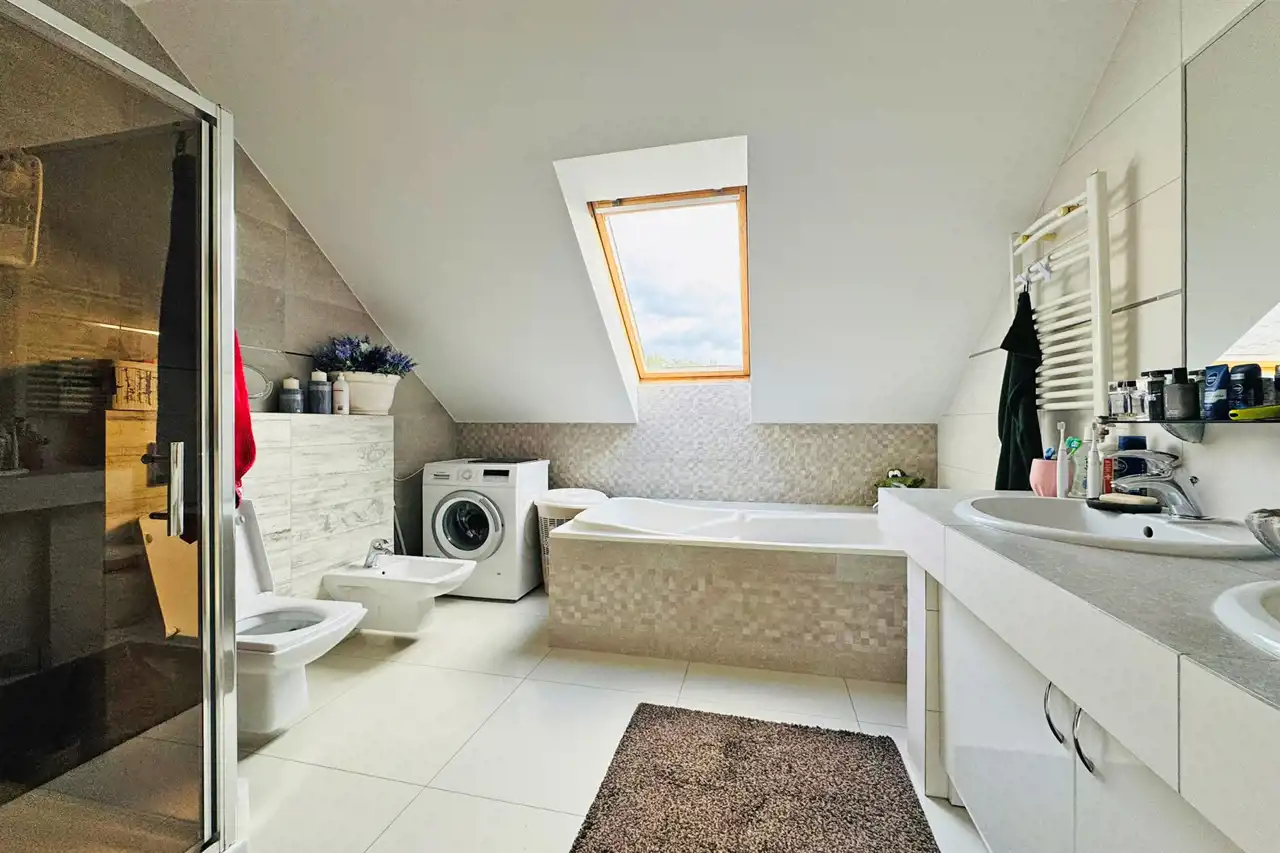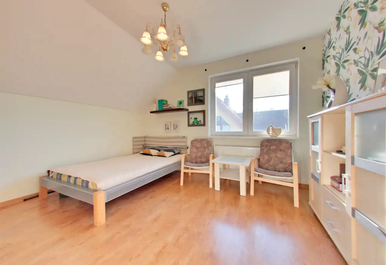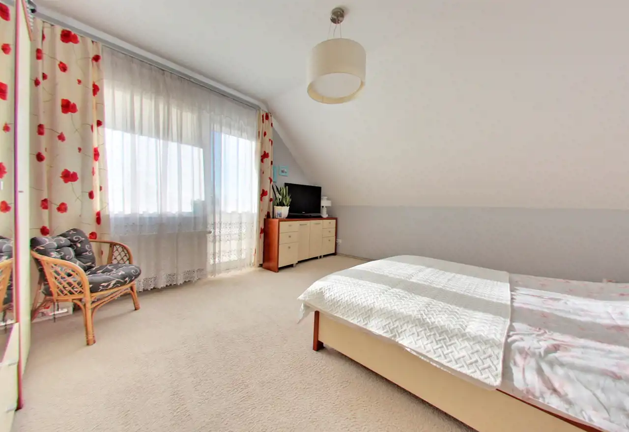 Na poddaszu użytkowym zaaranżowano trzy komfortowe sypialnie, dużą łazienkę z wanną, kabiną prysznicową i toaletą, a także dwa pokoje gościnne, każdy wyposażony we własną łazienkę.
