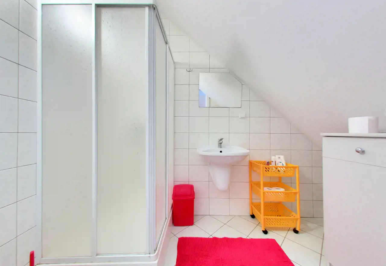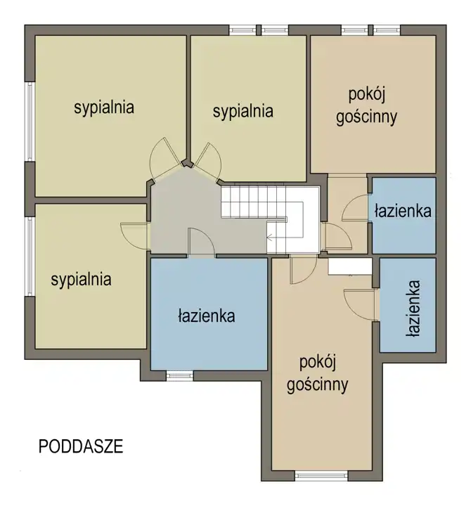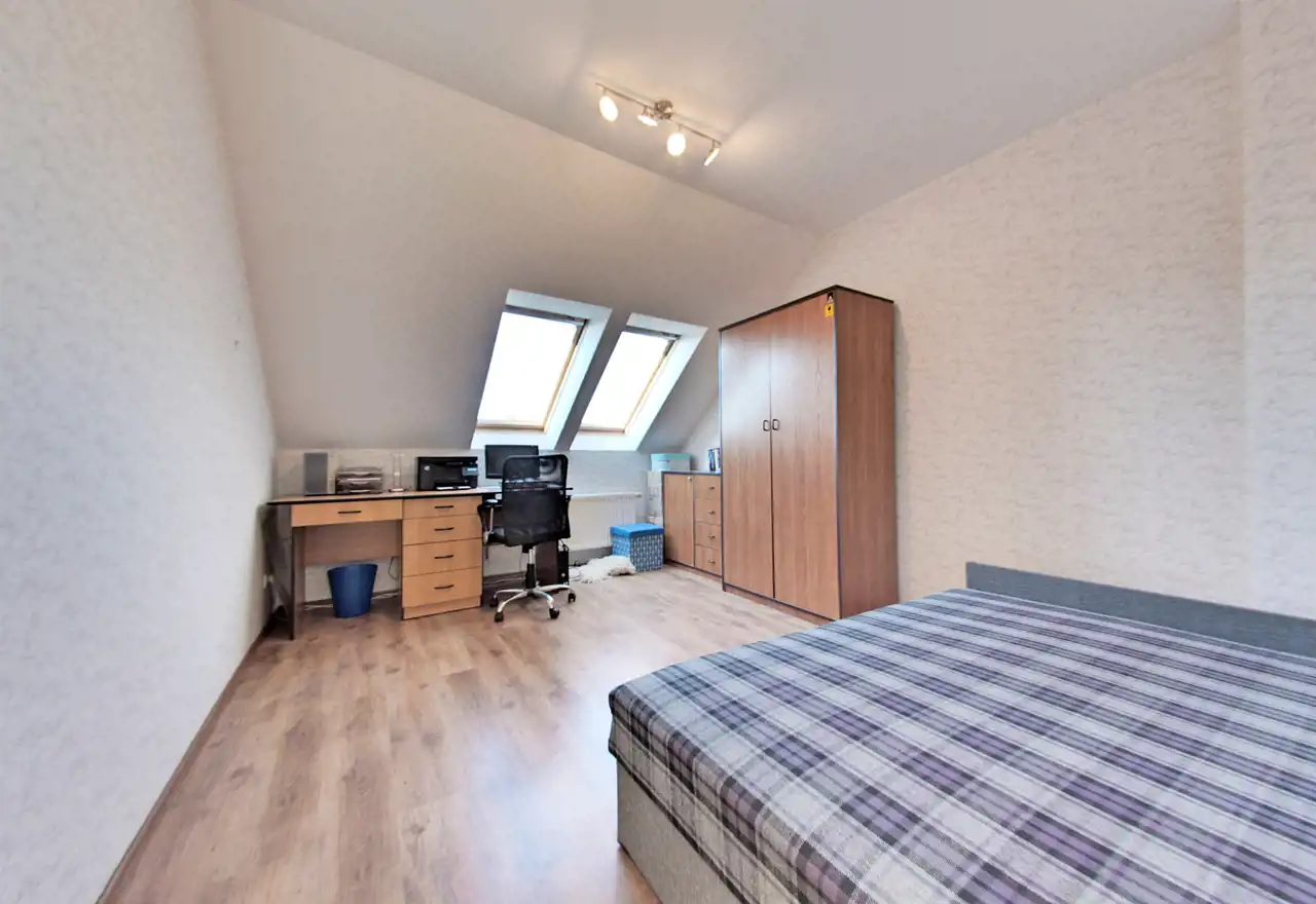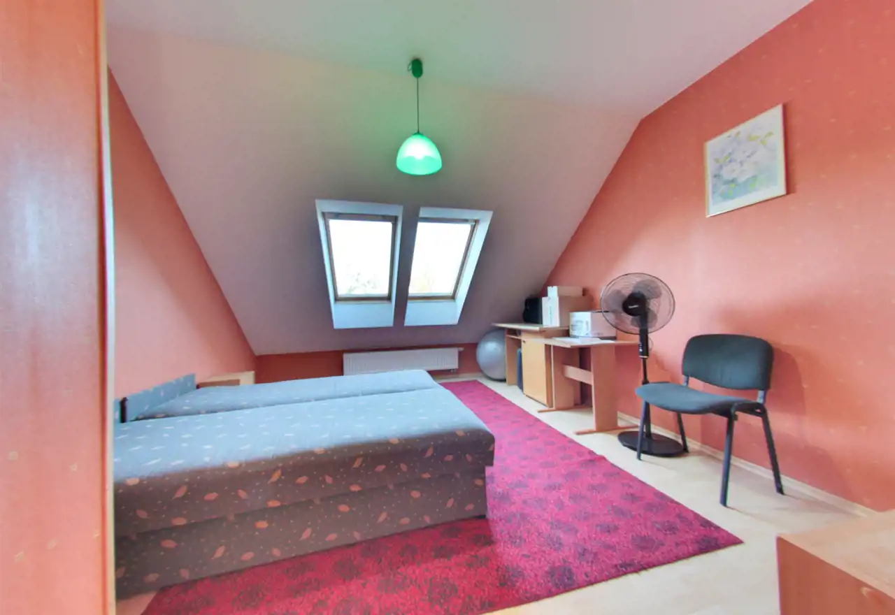 Na poddaszu użytkowym zaaranżowano trzy komfortowe sypialnie, dużą łazienkę z wanną, kabiną prysznicową i toaletą, a także dwa pokoje gościnne, każdy wyposażony we własną łazienkę.
