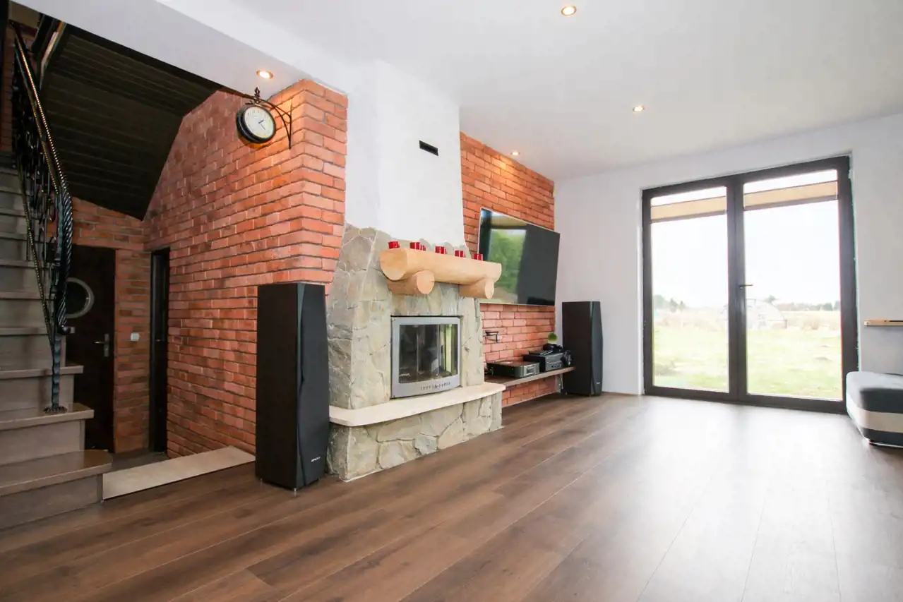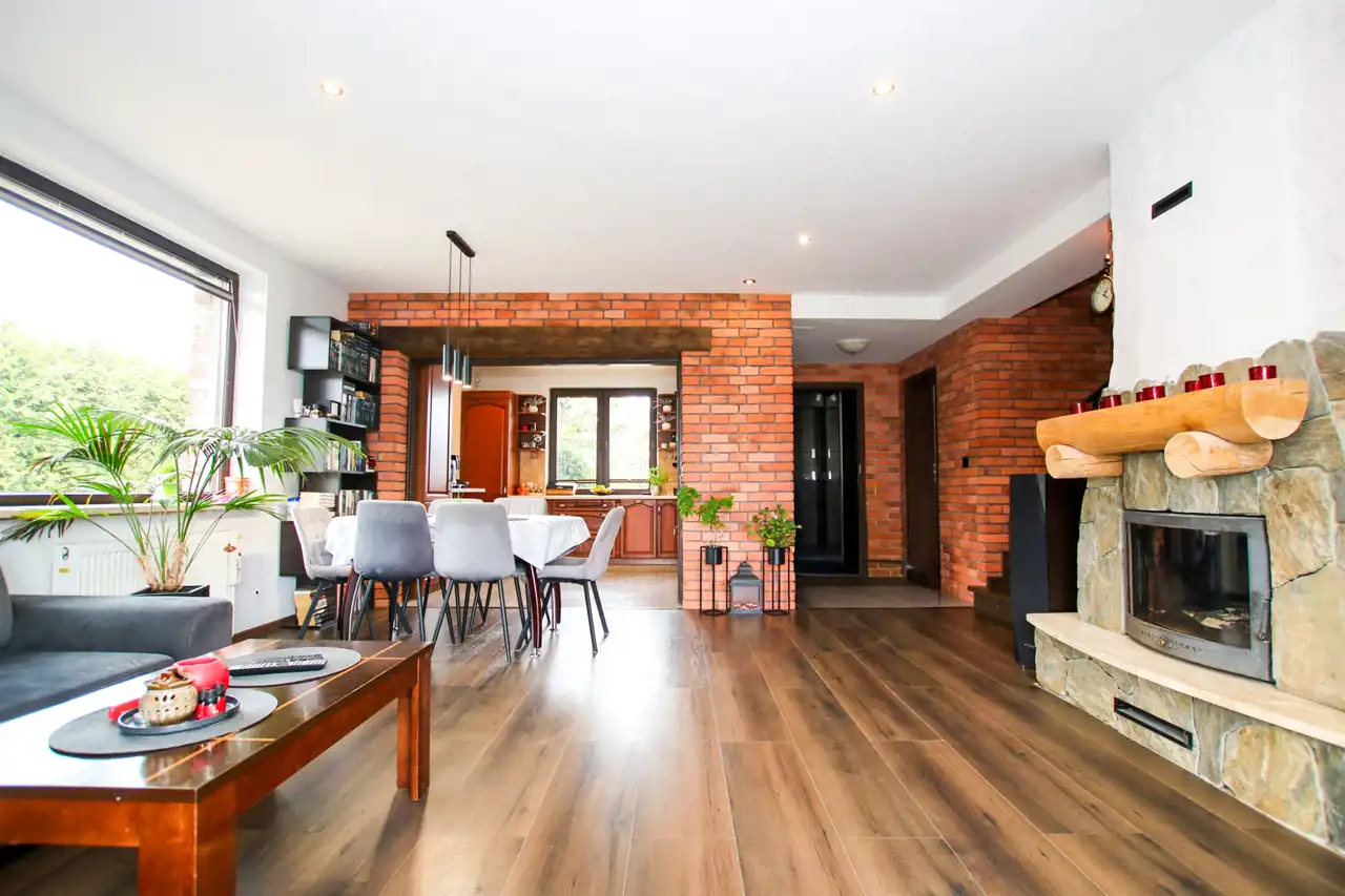 - dekoracyjne ściany z cegły, nadające wnętrzu charakteru