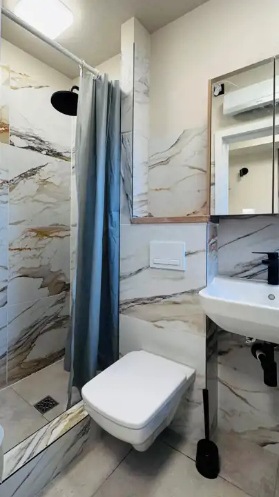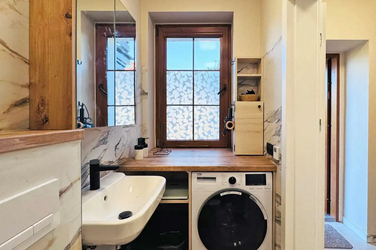 - Łazienka z WC i kabiną prysznicową; na wyposażeniu m.in. nowa, nieużywana pralka.
