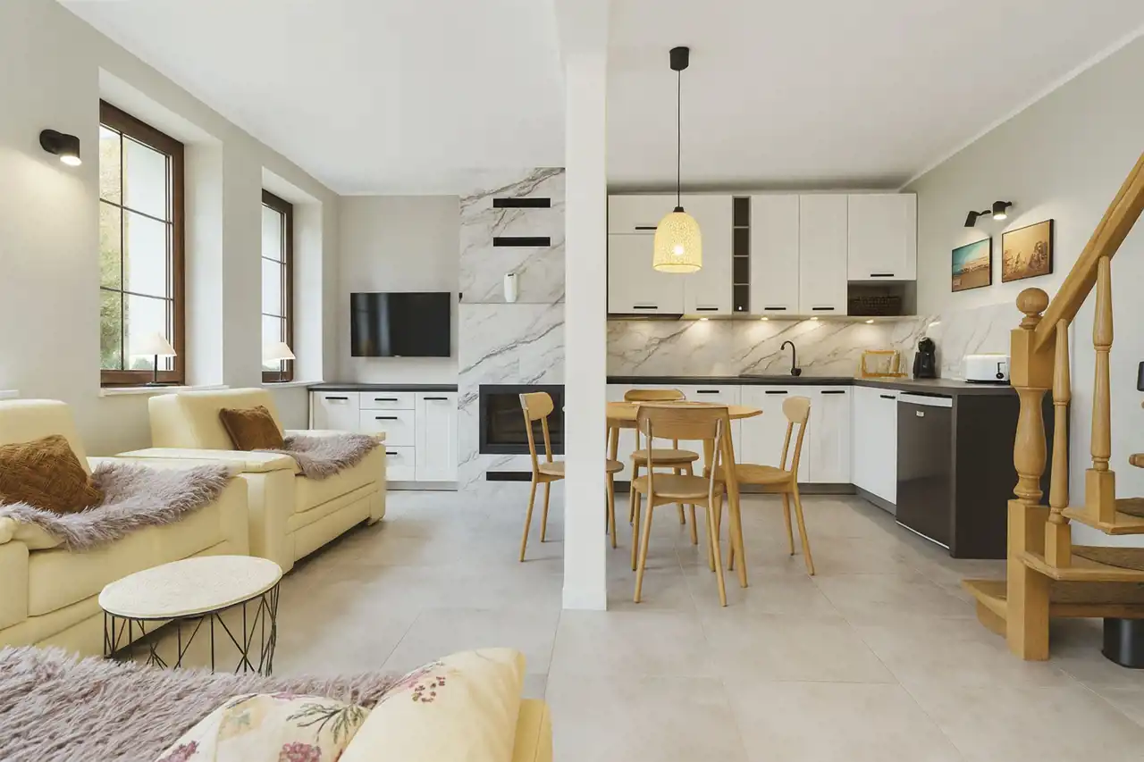 - kuchnia w pełni wyposażona, całość w nowych sprzętach AGD (w tym zmywarka) – wszystkie urządzenia nieużywane.