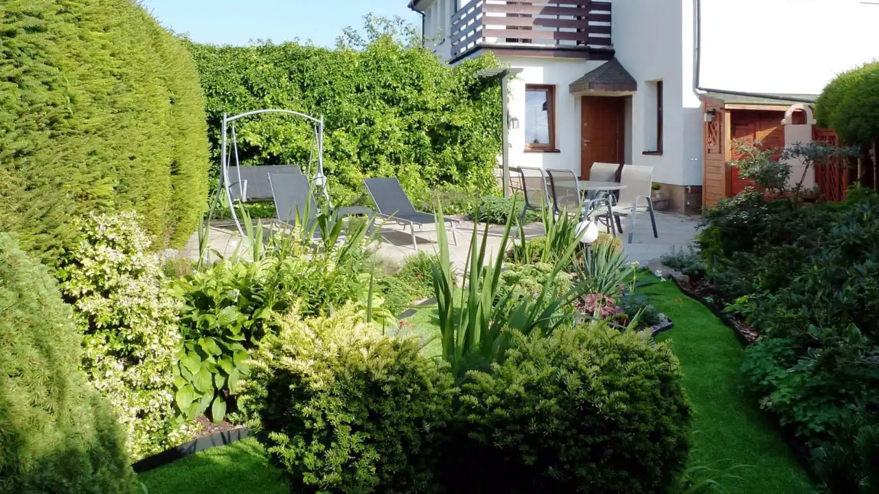 - prywatny ogród ok. 65 m² z przestronnym tarasem, wysokim żywopłotem (3 m) i pełną intymnością,