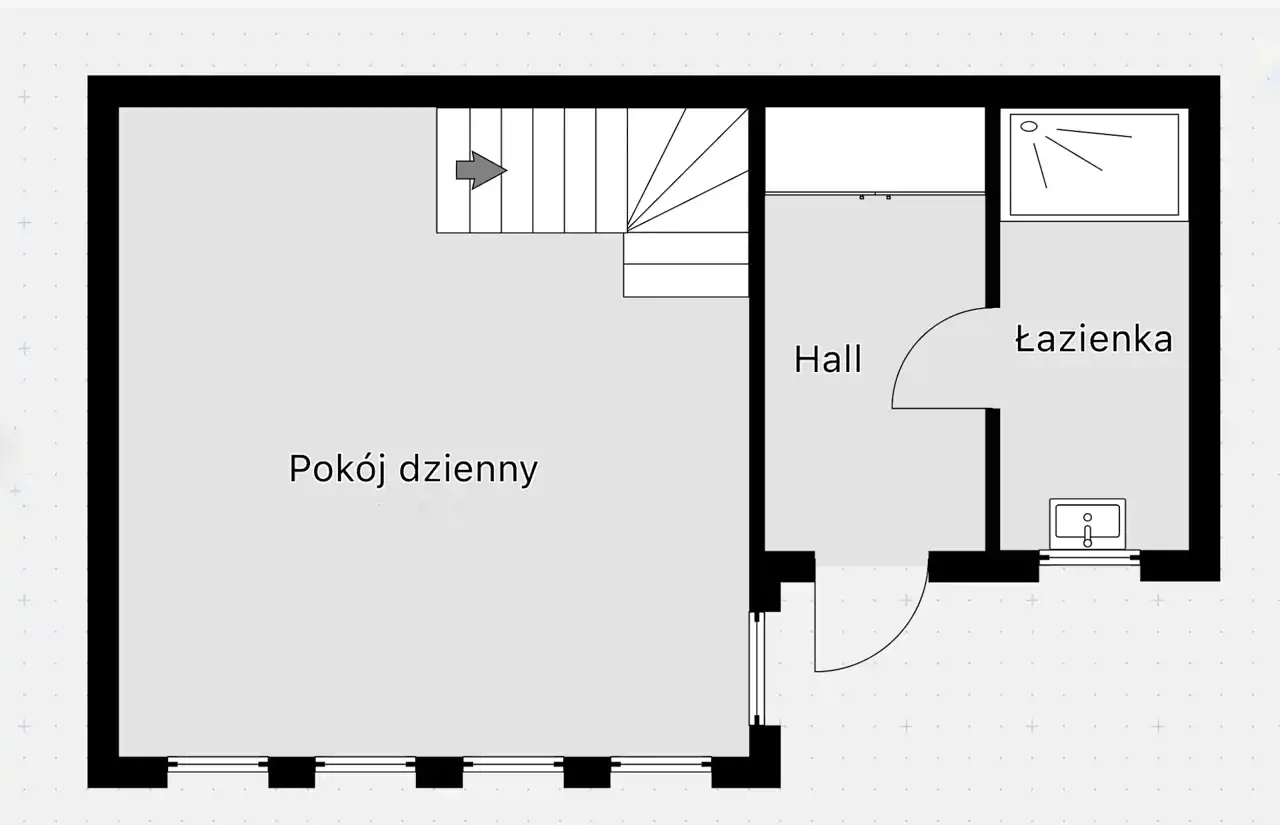- przestronny salon z aneksem kuchennym, łazienka z w.c. i korytarz,