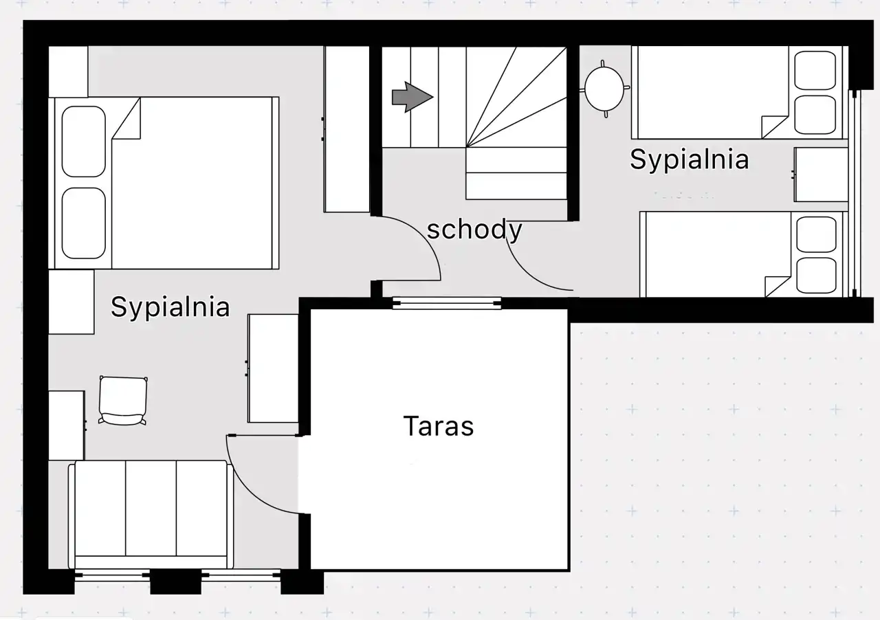 - Sypialnia główna ok. 15 m² – wyjście na słoneczny taras 9 m².