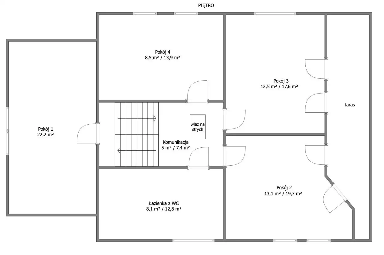 Piętro domu to powierzchnia 69,4m2, na którą składa się: komunikacja (5m2), łazienka z WC (8,1m2) oraz cztery pokoje (22,2m2, 13,1m2, 12,5m2, 8,5m2).