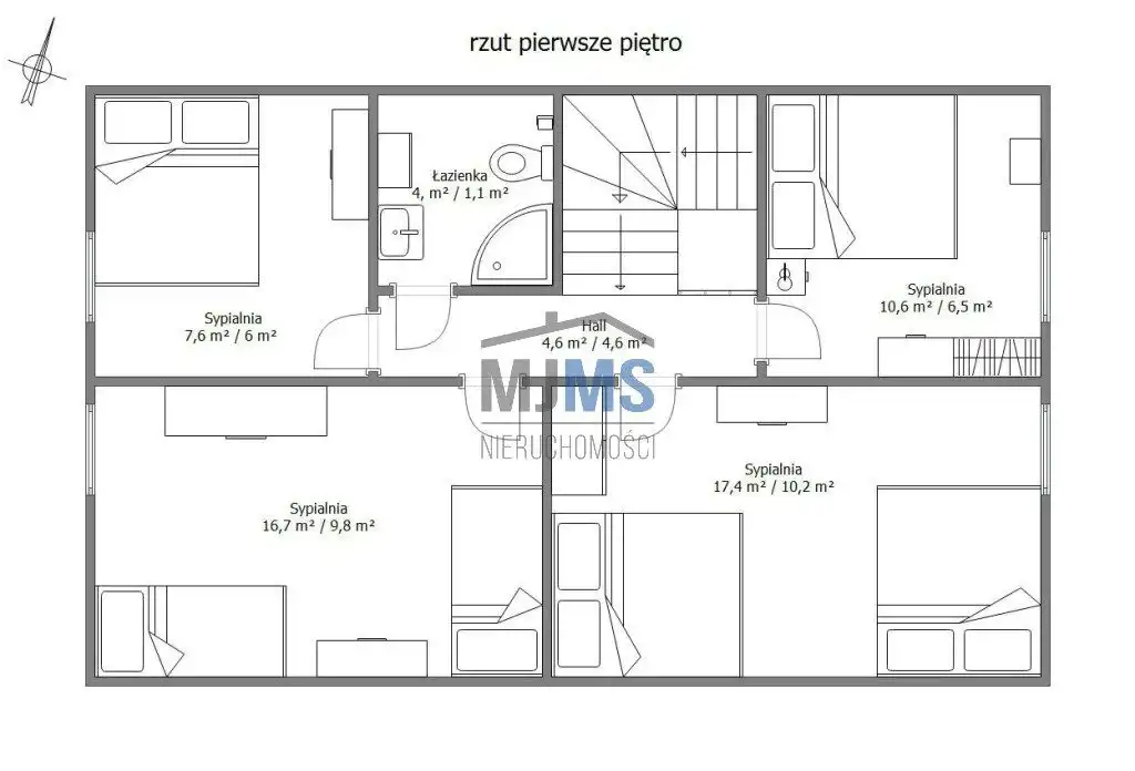 - 4 sypialnie: 17,4 m² | 16,7 m² | 10,6 m² | 7,6 m²