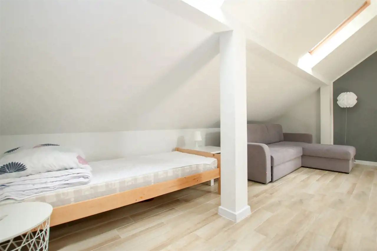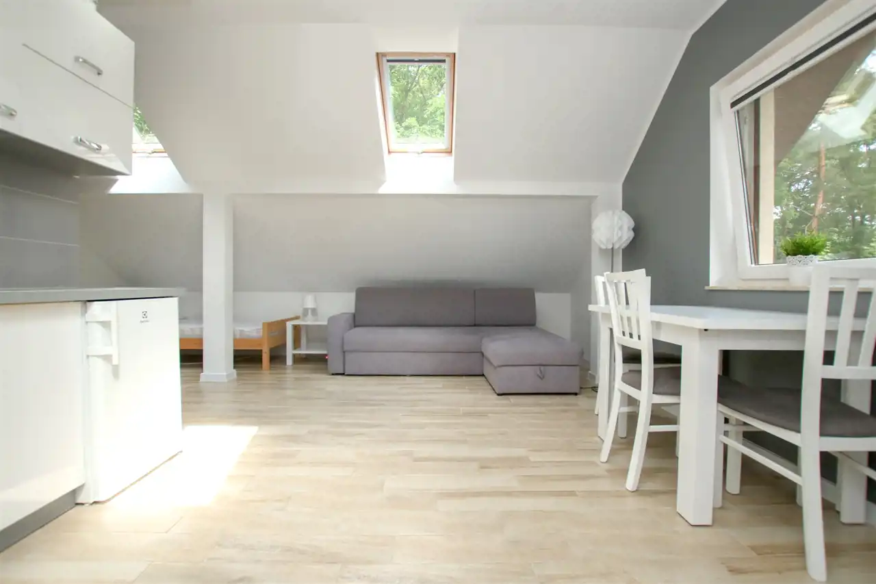 Świetna lokalizacja - Dębina to cicha alternatywa dla zatłoczonych kurortów, a jednocześnie bliskość Poddąbia i Rowów daje dostęp do atrakcji turystycznych. Apartament znajduje się na poddaszu.