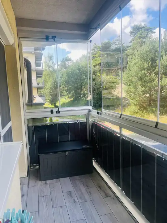 - ogromny balkon/loggia z zabudową szklaną tworzy następne pomieszczenie(ochrona przed deszczem, wiatrem i hałasem, możliwość całkowitego lub częściowego otwarcia)
