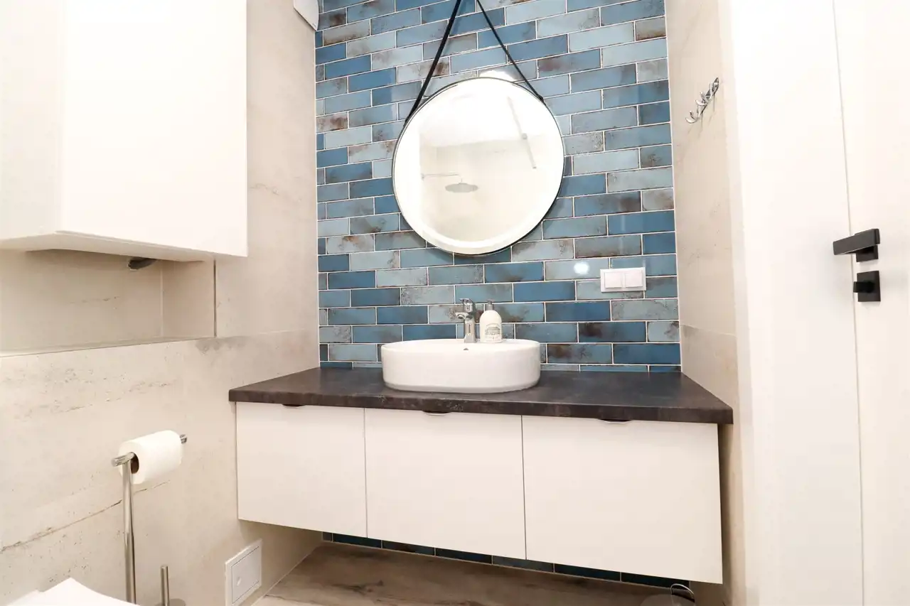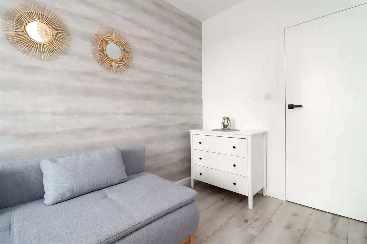 Apartament został urządzony z dbałością o detale oraz spójność stylistyczną. Wnętrza utrzymane są w jasnej, nadmorskiej kolorystyce, a dekoracje ścienne subtelnie nawiązują do wakacyjnego klimatu Bałtyku. To gotowa do zamieszkania nieruchomość – bez konieczności ponoszenia dodatkowych nakładów finansowych.
