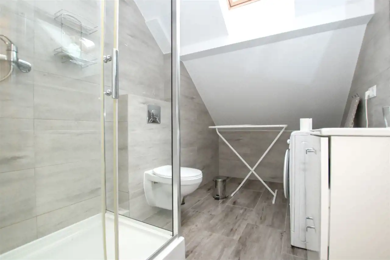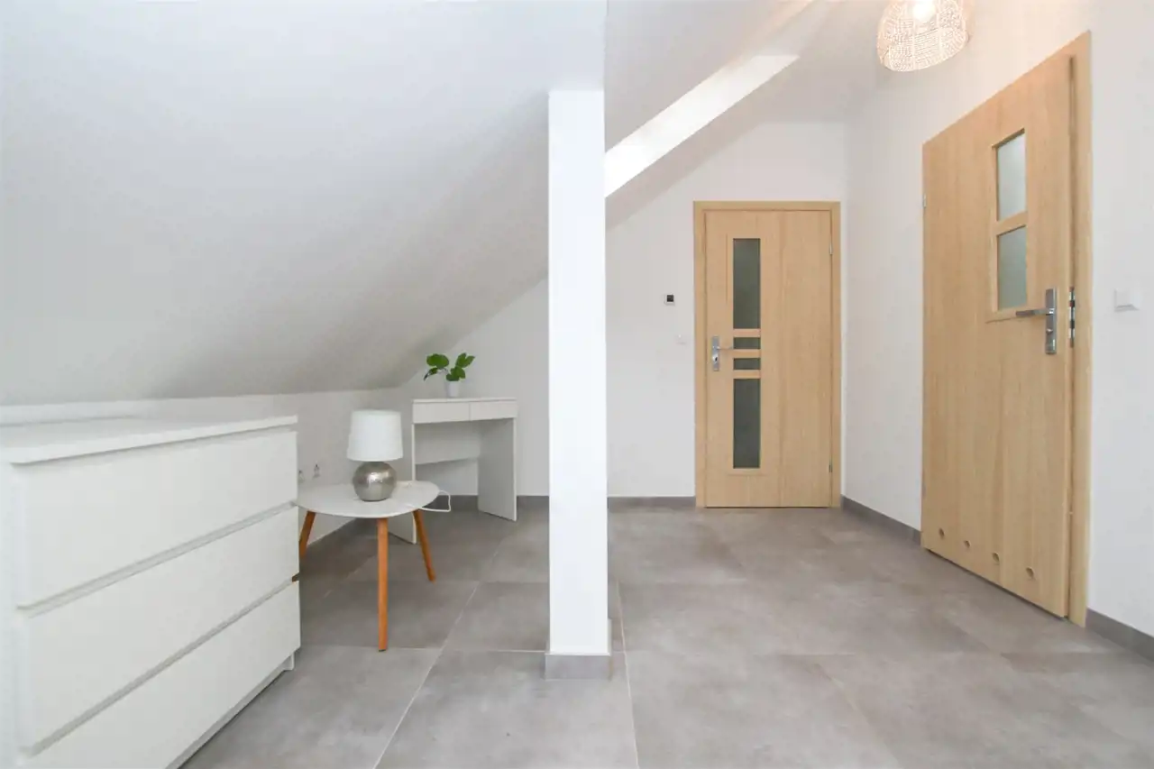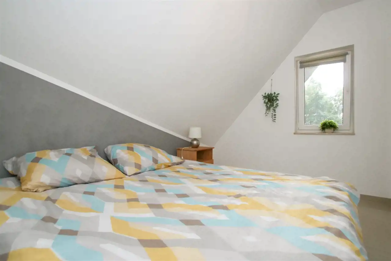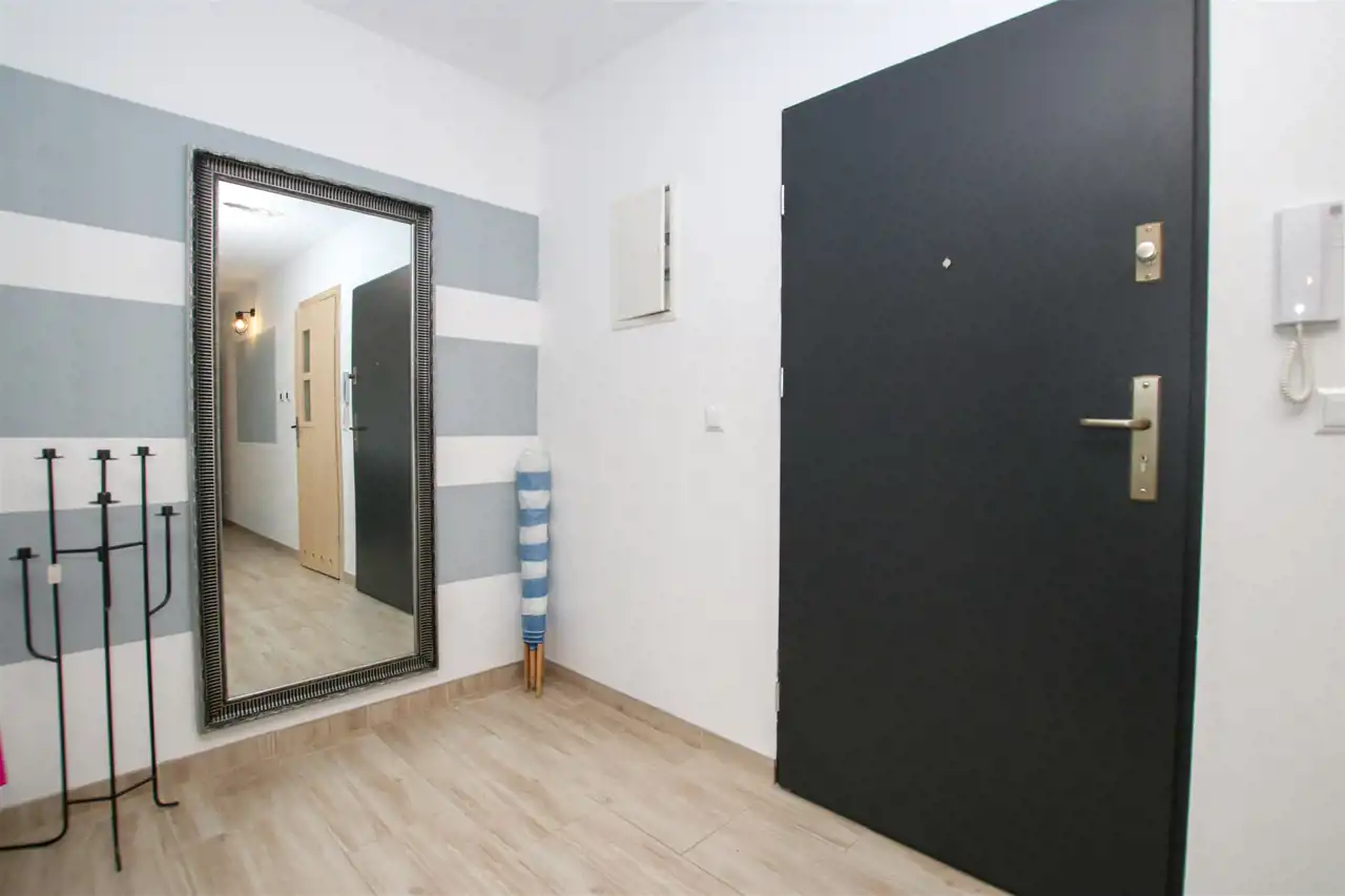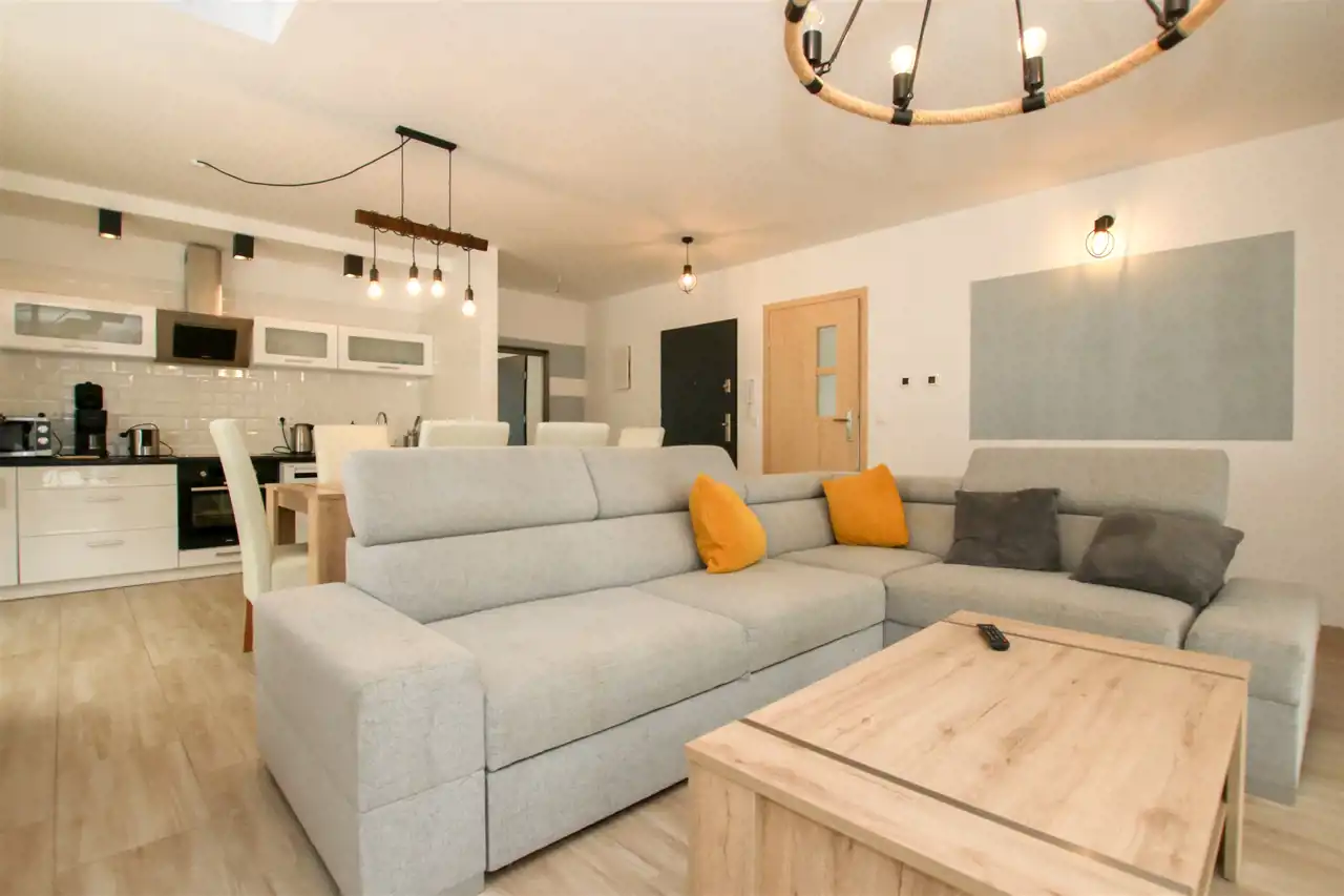 Nowoczesne wnętrze o funkcjonalnym układzie: przestronny salon z aneksem kuchennym z miejscem na przestrzeń wypoczynkową, łazienka oraz wygodny przedpokój. Wysoki standard wykończenia - gresy, nowoczesna armatura, drewniane akcenty i naturalne kolory tworzą klimat komfortu i relaksu. Na poziomie drugim znajduje się przestrzeń sypialniana z łóżkami, toaletką oraz osobną sypialnią z podwójnym łóżkiem. Dodatkowym atutem jest druga łazienka, która umili pobyt całej rodzinie i nikt nie będzie czekał w kolejce do toalety. W apartamencie jest ogrzewanie podłogowe. W pełni umeblowany i wyposażony: pralka, lodówka, płyta indukcyjna, zmywarka, telewizor, czajnik, naczynia - wszystko, czego potrzebujesz, by od razu zacząć wynajmować lub wypoczywać.