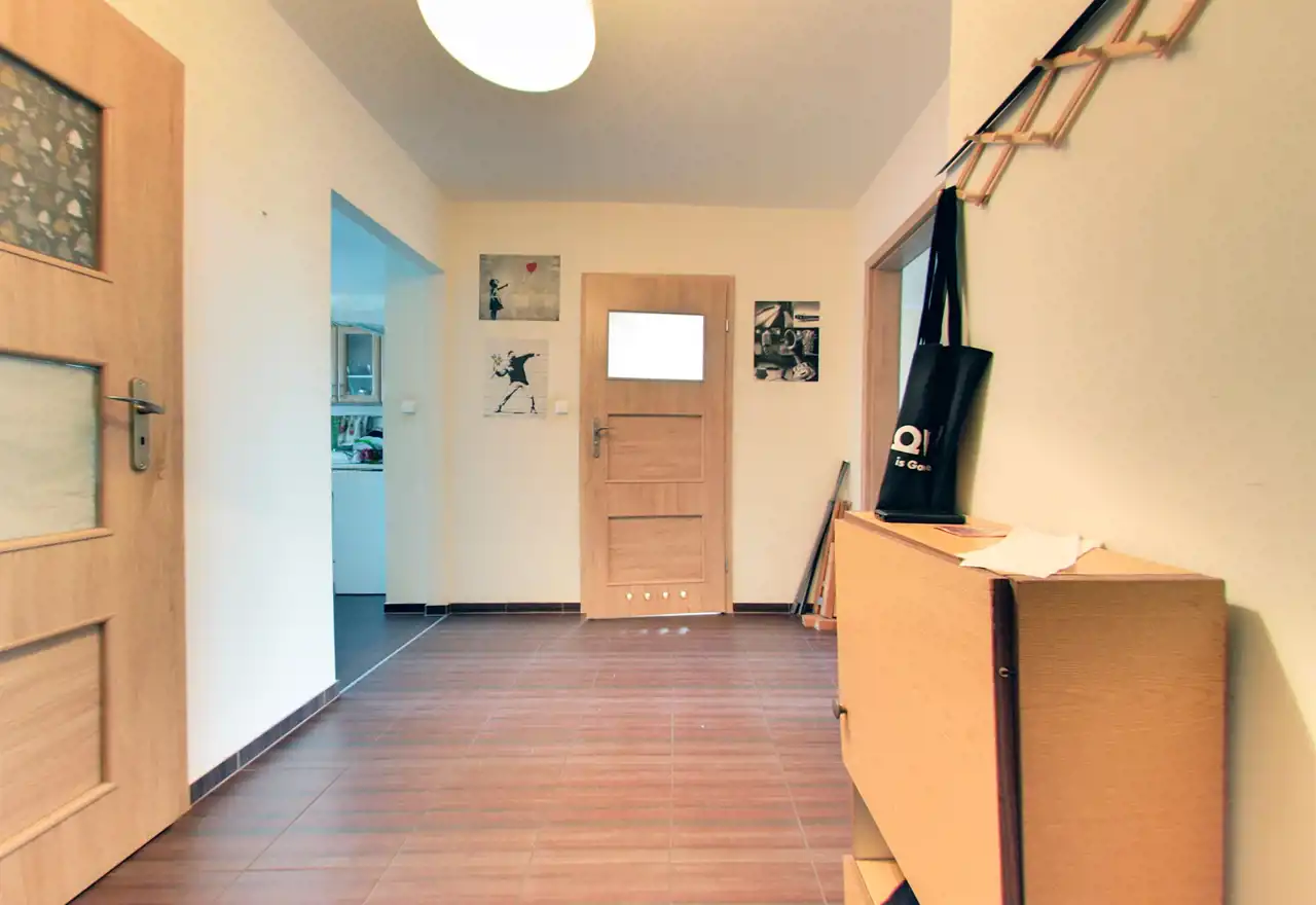 Wnętrze ciepłe i słoneczne. Na ścianach tynki gładkie, na podłogach w pokojach panele podłogowe, a w kuchni, łazience i przedpokoju - gres. Okna PCV. Ogrzewanie i ciepła woda z sieci miejskiej – bezobsługowe i ekonomiczne rozwiązanie.
