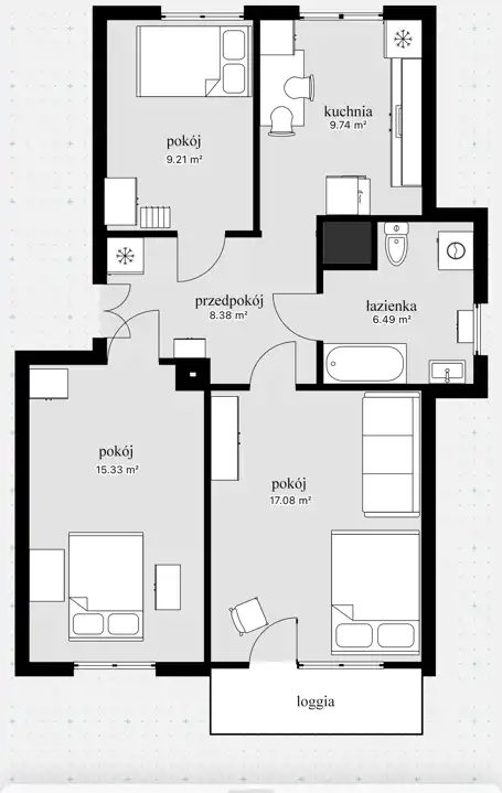 W skład lokalu wchodzą: trzy pokoje, kuchnia, łazienka z w.c. i przedpokój. Wejście z klatki schodowej do przedpokoju, a z niego wejścia do poszczególnych pomieszczeń - mieszkanie rozkładowe. Z salonu wyjście na dużą loggię, idealną do wypoczynku na świeżym powietrzu. Kuchnia i łazienka – z oknami, co zapewnia naturalne doświetlenie i komfort użytkowania.
