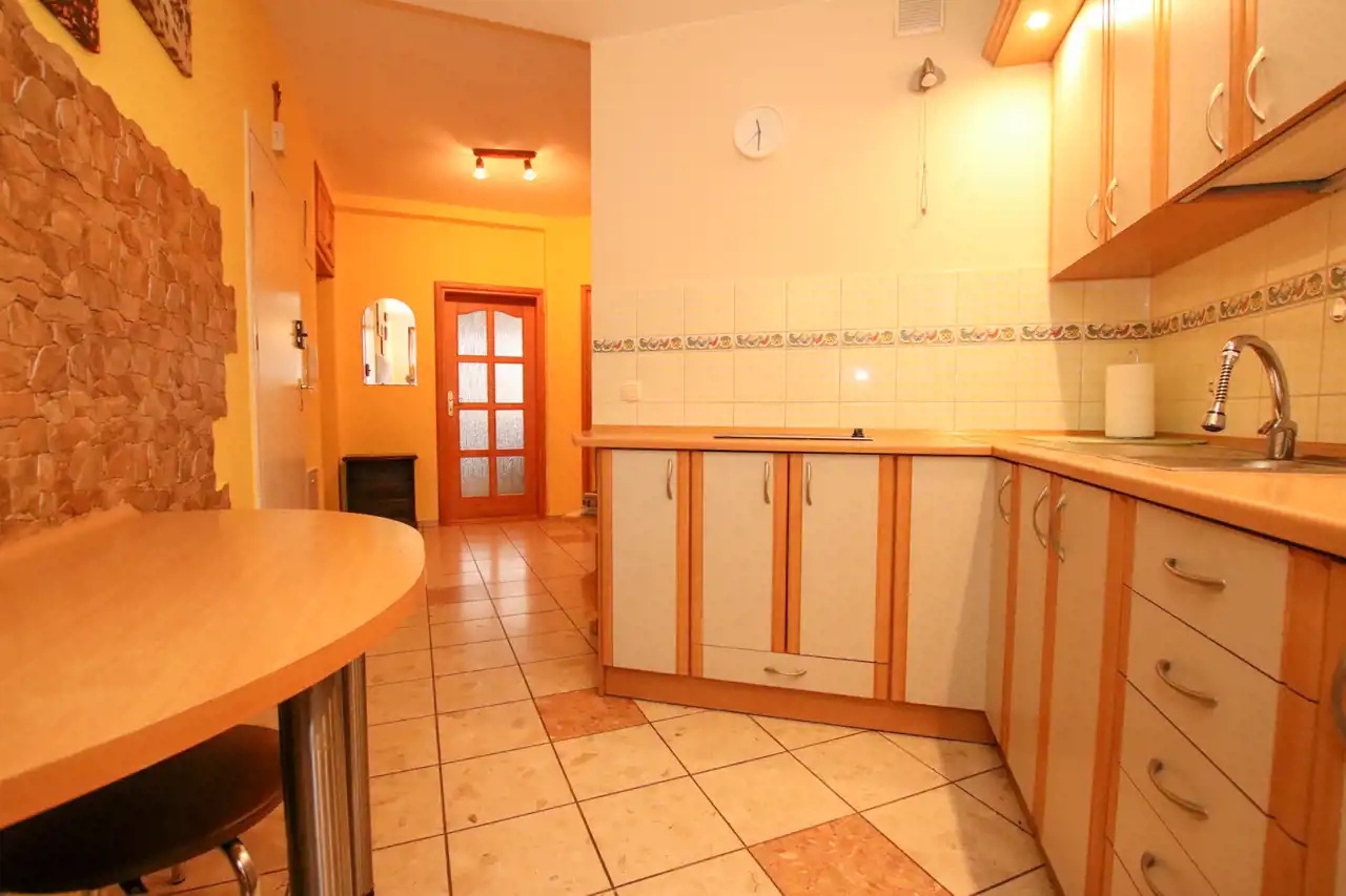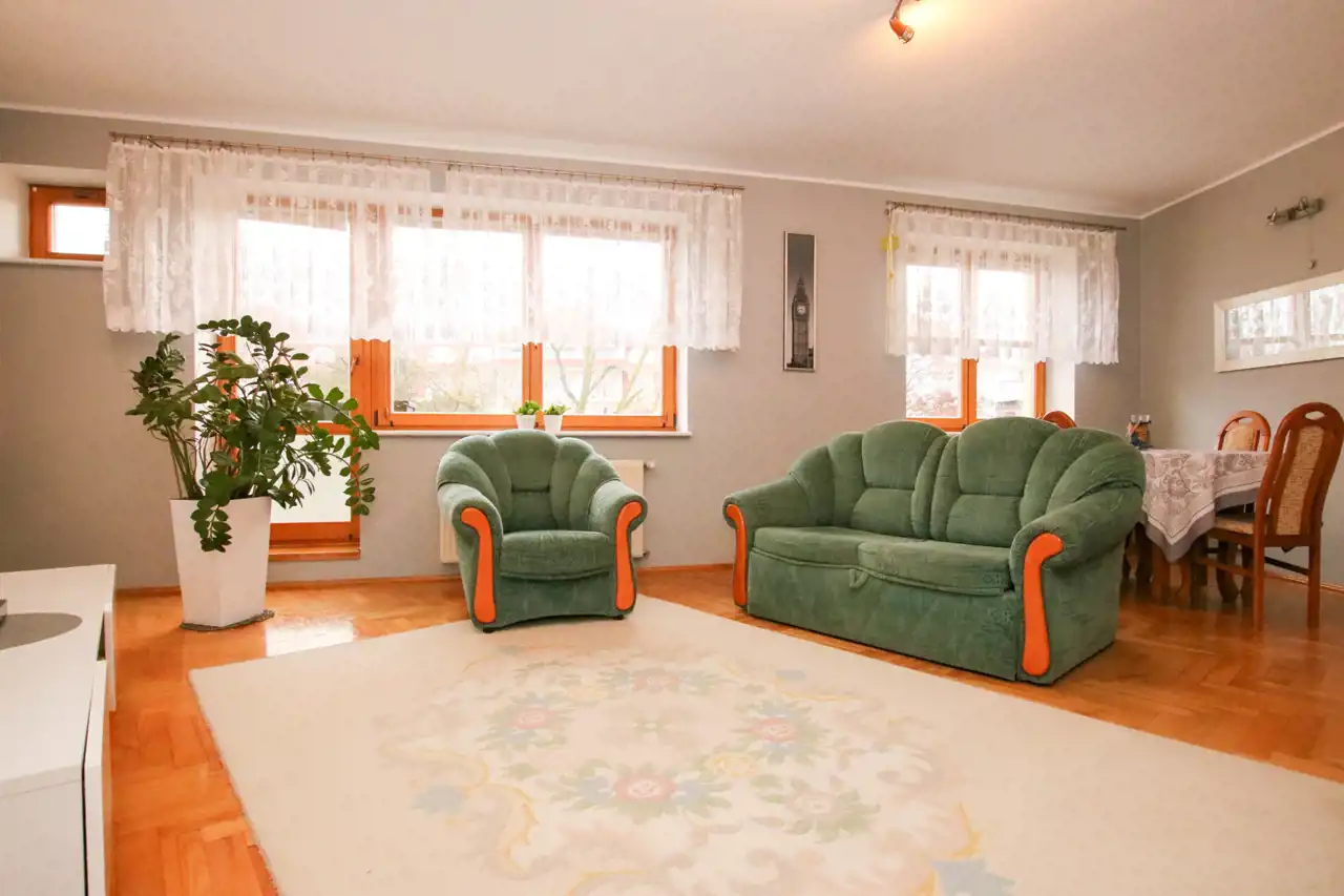 W mieszkaniu znajdują się dwa przestronne pokoje, duży salon z widokiem na zieleń, funkcjonalna kuchnia z jadalnią, łazienka z wanną oraz wygodna garderoba. Drewniane okna nowego typu podkreślają standard wykończenia, a naturalne kolory wnętrz tworzą ciepły i przytulny klimat. Stan lokalu pozwala na wprowadzenie się od razu, bez konieczności większych nakładów.
