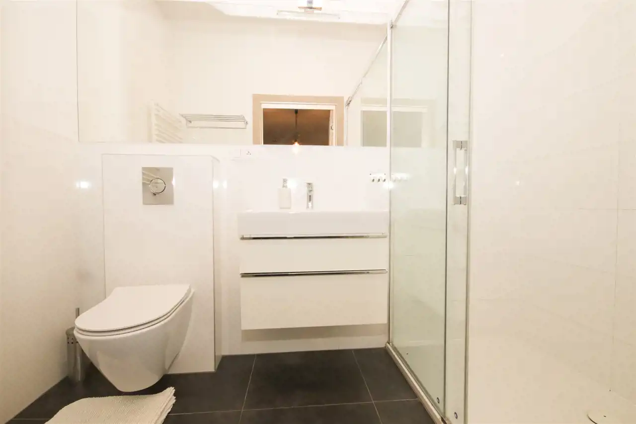 Nowoczesna, praktyczna łazienka wyposażona w prysznic, WC i umywalkę.