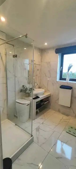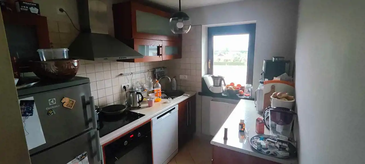 Wysoki parter: 110m2 - salon z kominkiem z wyjściem na duży zadaszony taras o pow. 30 m2 ( dodatkowo zainstalowany klimatyzator ), 2 sypialnie, kuchnia, łazienka, wc, duży przedpokój, wiatrołap,