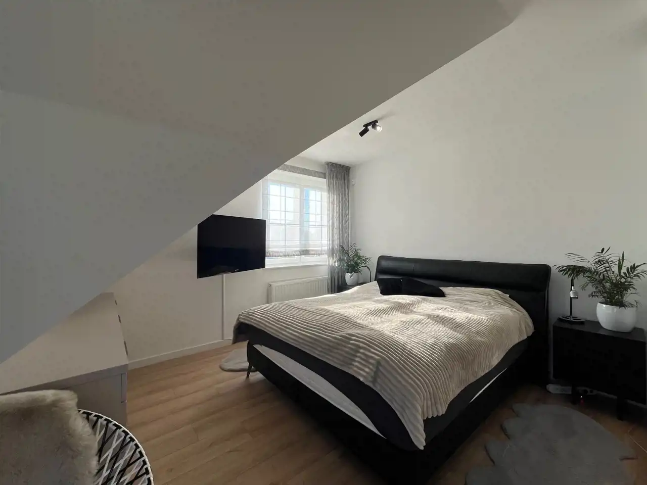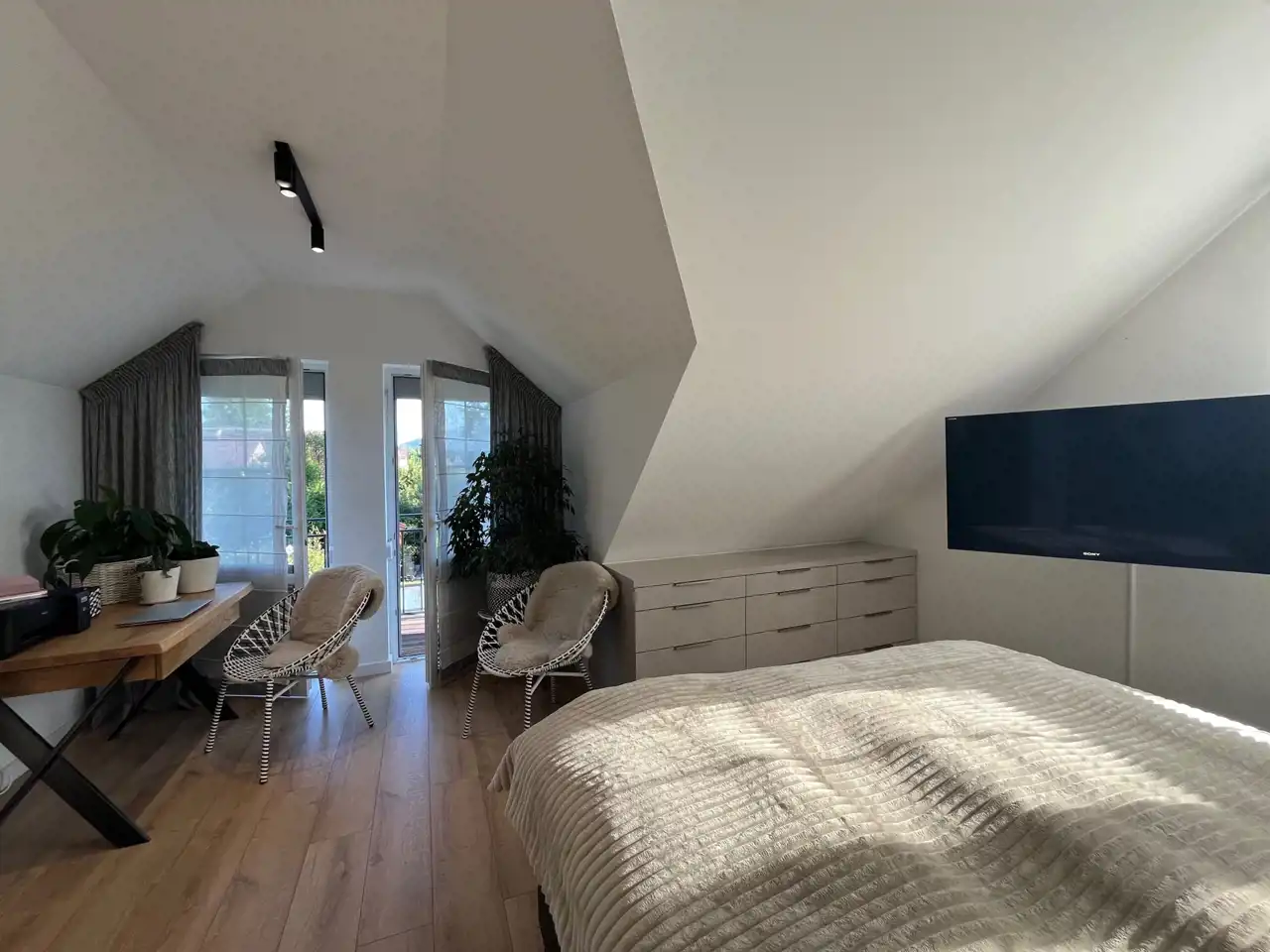 1 Piętro: duża sypialnia z garderobą i wyjściem na widokowy balkon, pokój gościnny, łazienka.