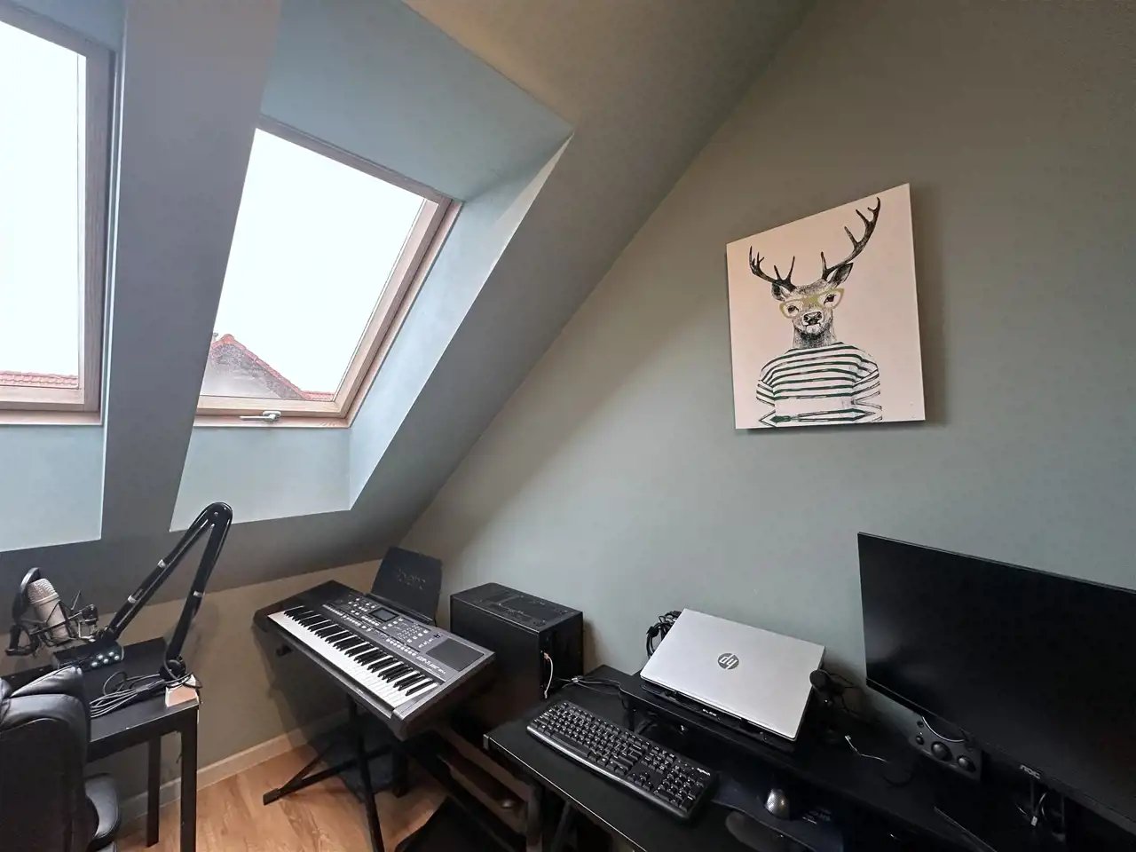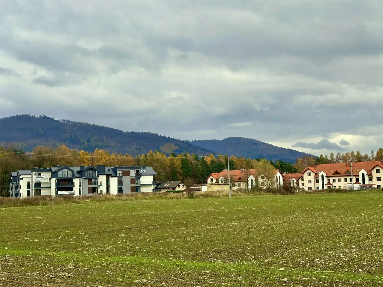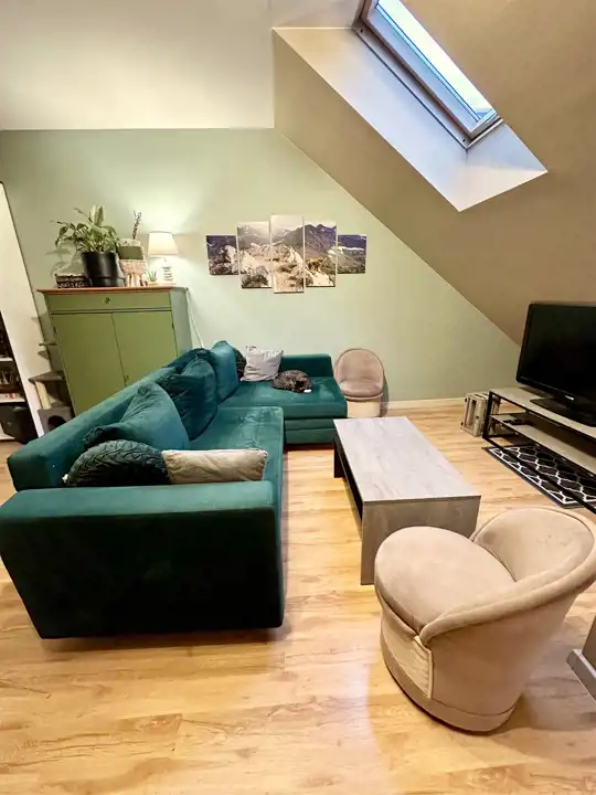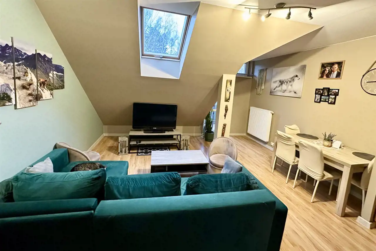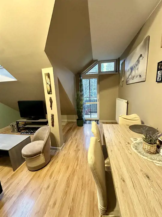 połączony z aneksem kuchennym, przedpokój. Drugie piętro. Z balkonu widać las i góry.
