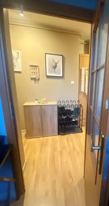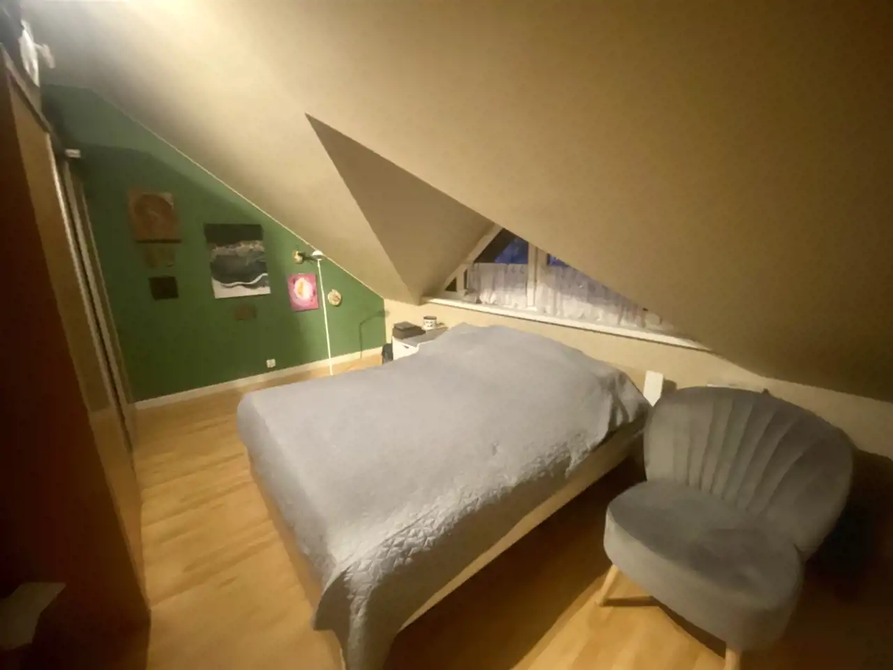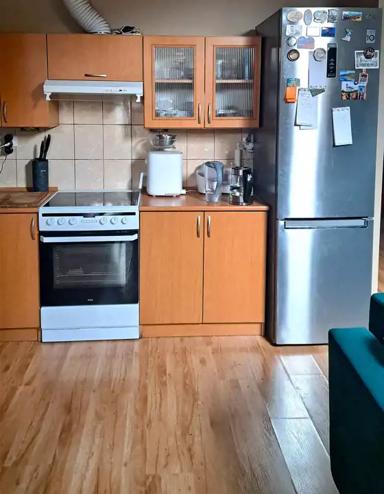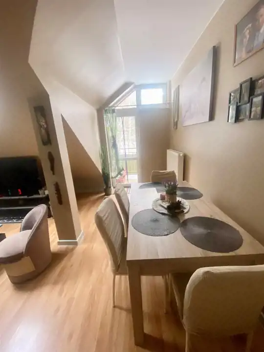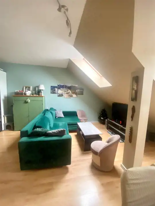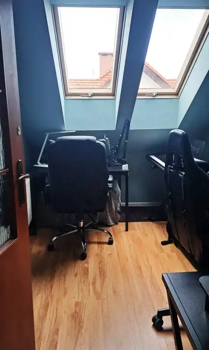 połączony z aneksem kuchennym, przedpokój. Drugie piętro. Z balkonu widać las i góry.