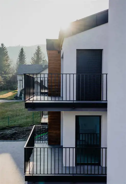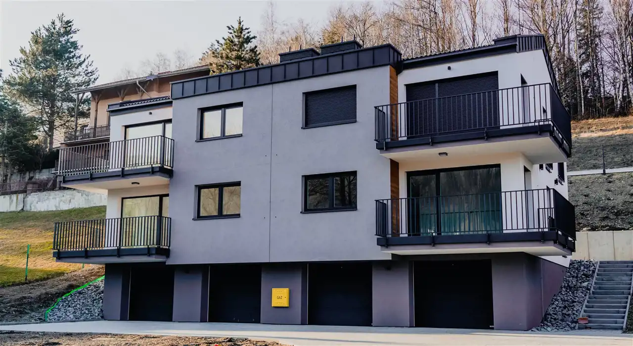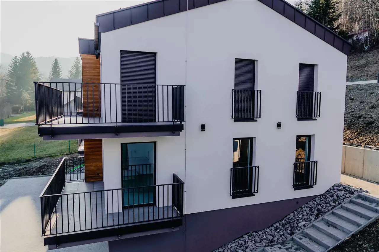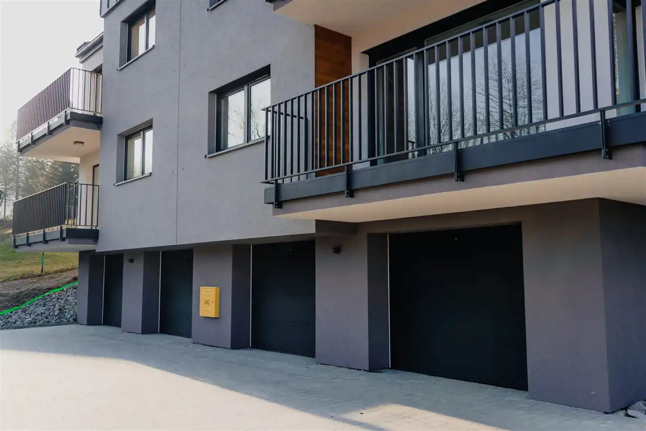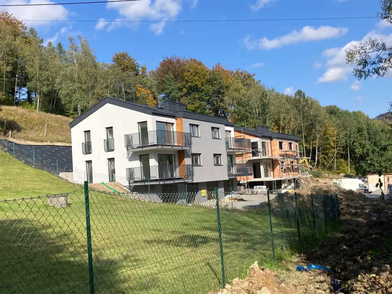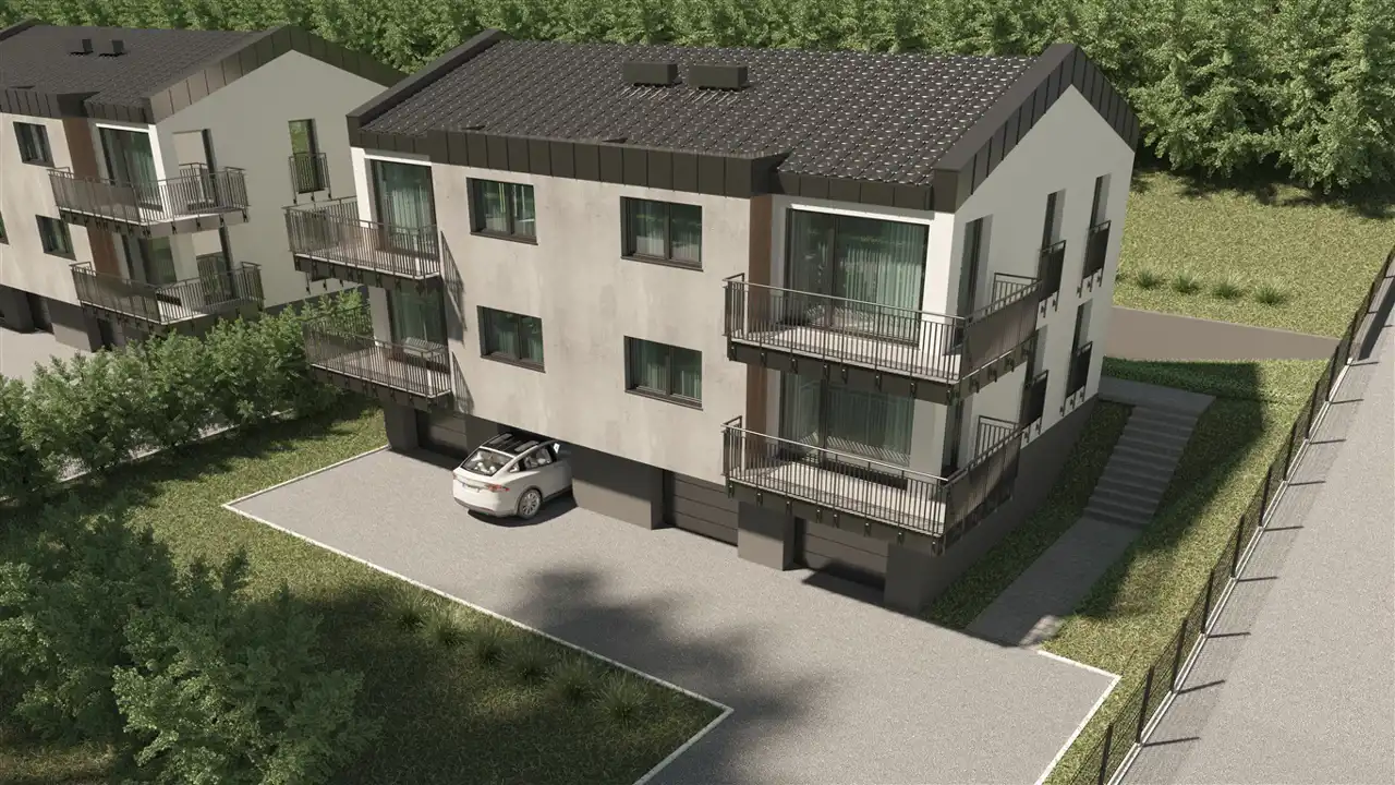 Każdy apartament posiada dwie sypialnie, salon z aneksem kuchennym i wyjściem na duży balkon, łazienkę, hol, komórkę oraz duży garaż. Osiedle położone jest przy lesie, na wzniesieniu zapewniającym piękne widoki na okoliczne góry. Dogodny dojazd do centrum Ustronia i do Wisły. Apartamenty znajdują się na końcu asfaltowej „ślepej” ulicy. W pobliżu są liczne szlaki turystyczne, wyciągi narciarskie, basen. Okolica cieszy się również uznaniem właścicieli dużych, ekskluzywnych rezydencji. Apartamenty oferowane są w stanie deweloperskim. Części wspólne zostaną wykonane w wysokim standardzie.