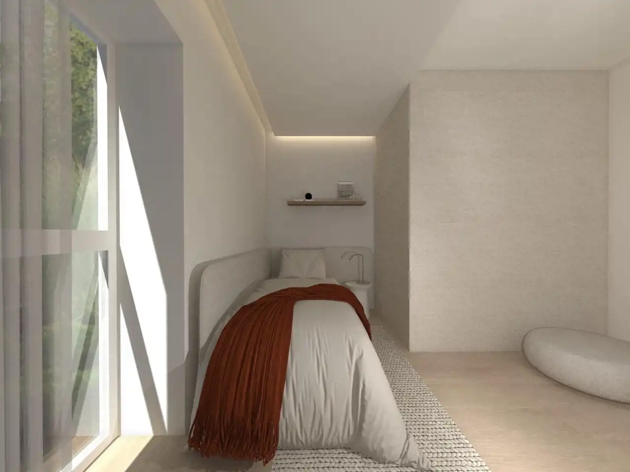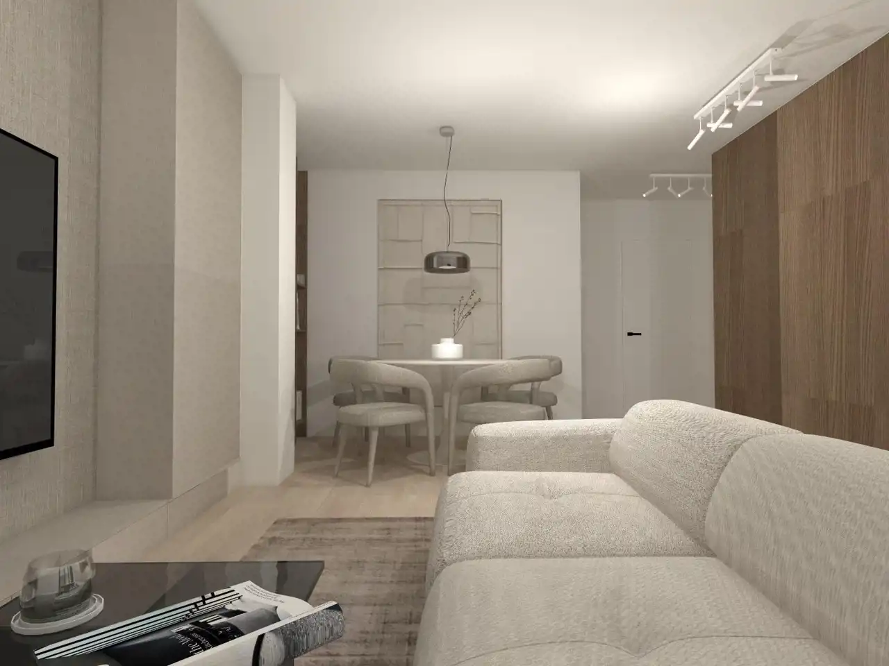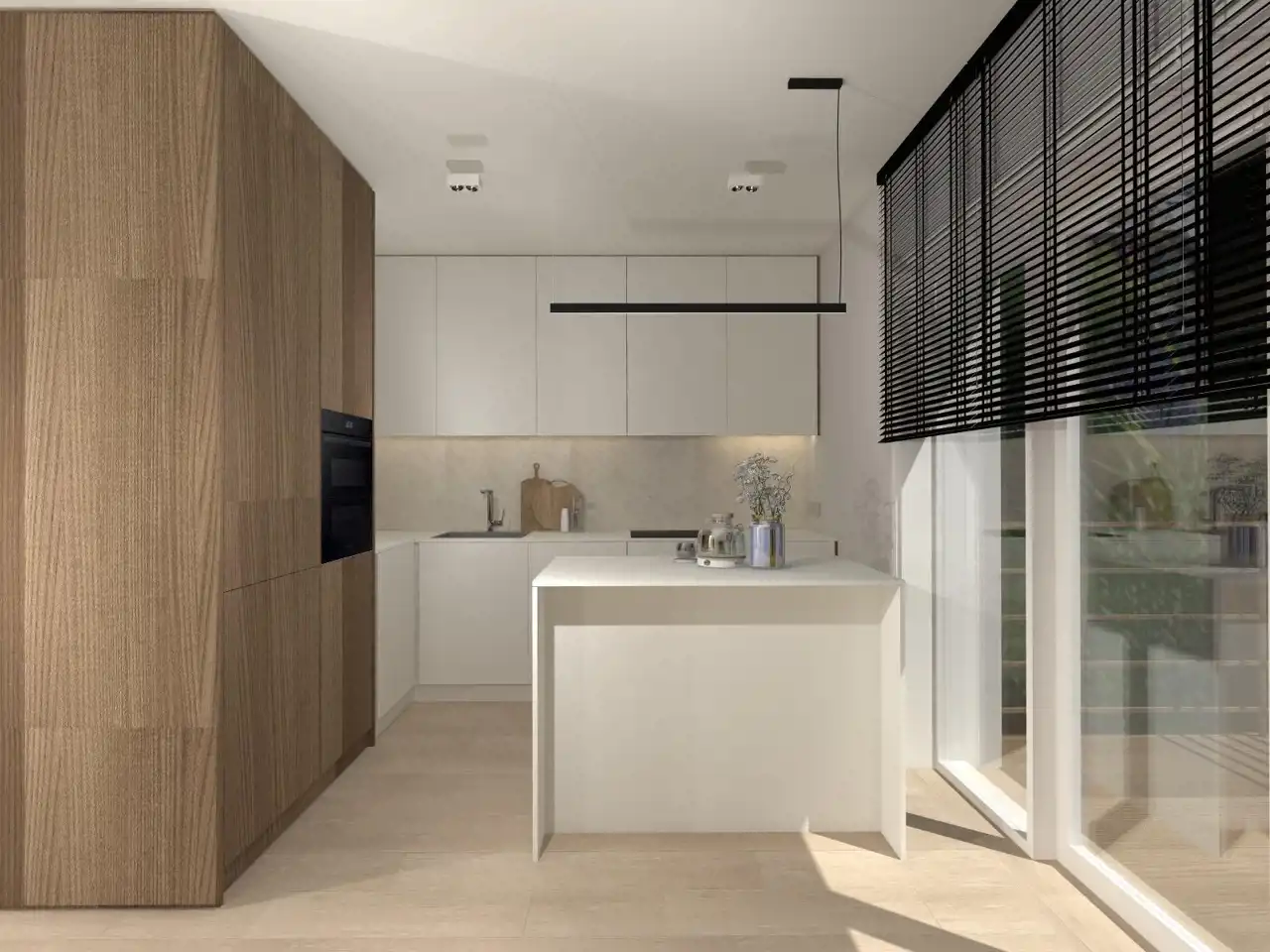 - Przestronny salon z aneksem kuchennym – serce apartamentu z wyjściem na balkon.