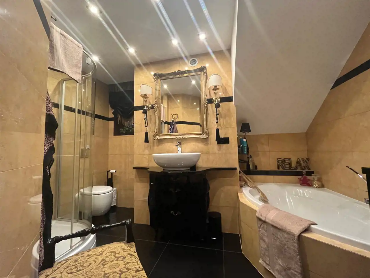 Lokal jest wykończony w wysokim standardzie: ogrzewanie podłogowe podzielone na strefy, kominek, duża łazienka z prysznicem i wanną.